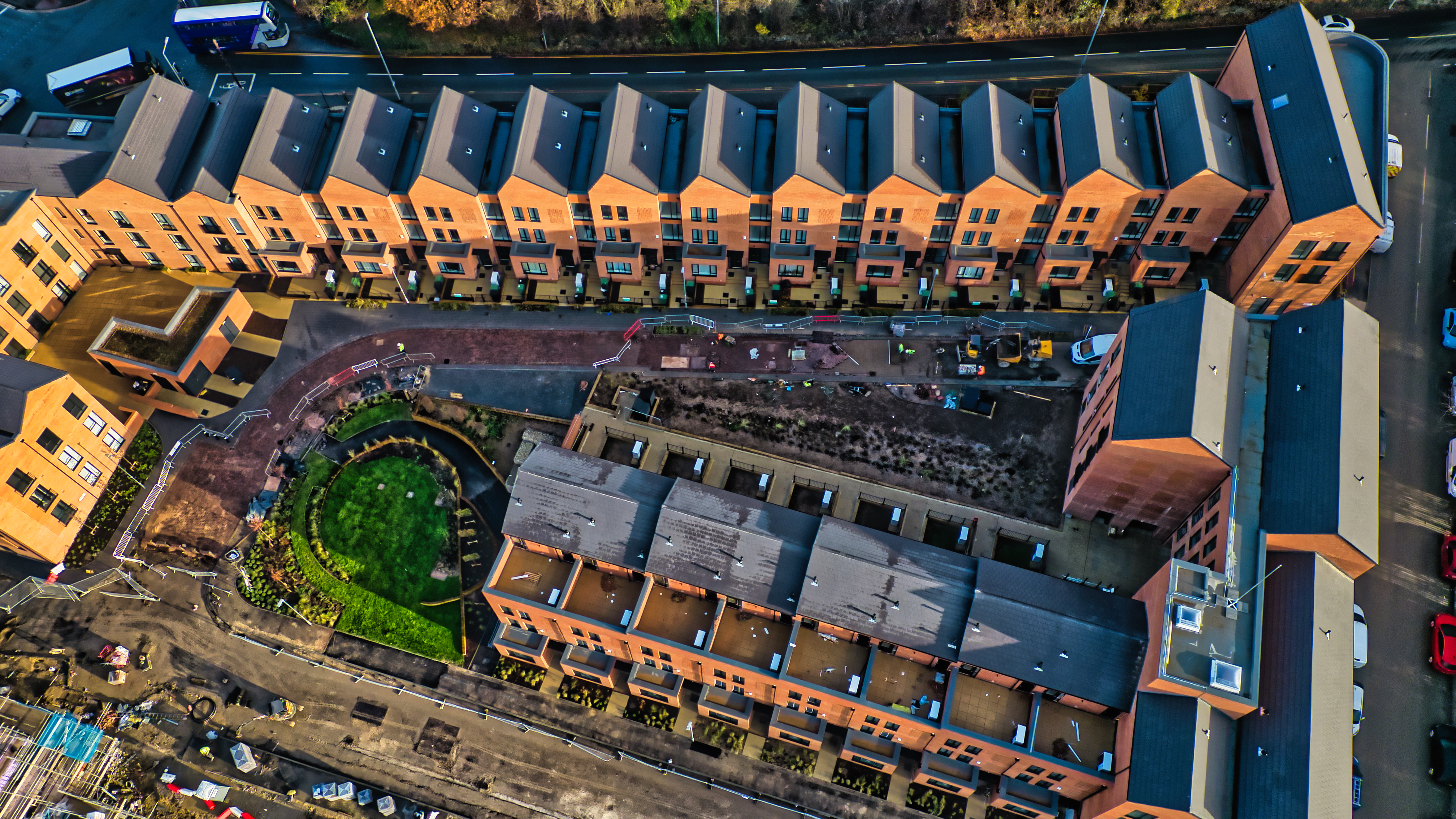Aerial view of a new housing development under construction. Multiple rows of townhouses, varied building stages, landscaping in progress. Dark rooftops contrast with brick facades.