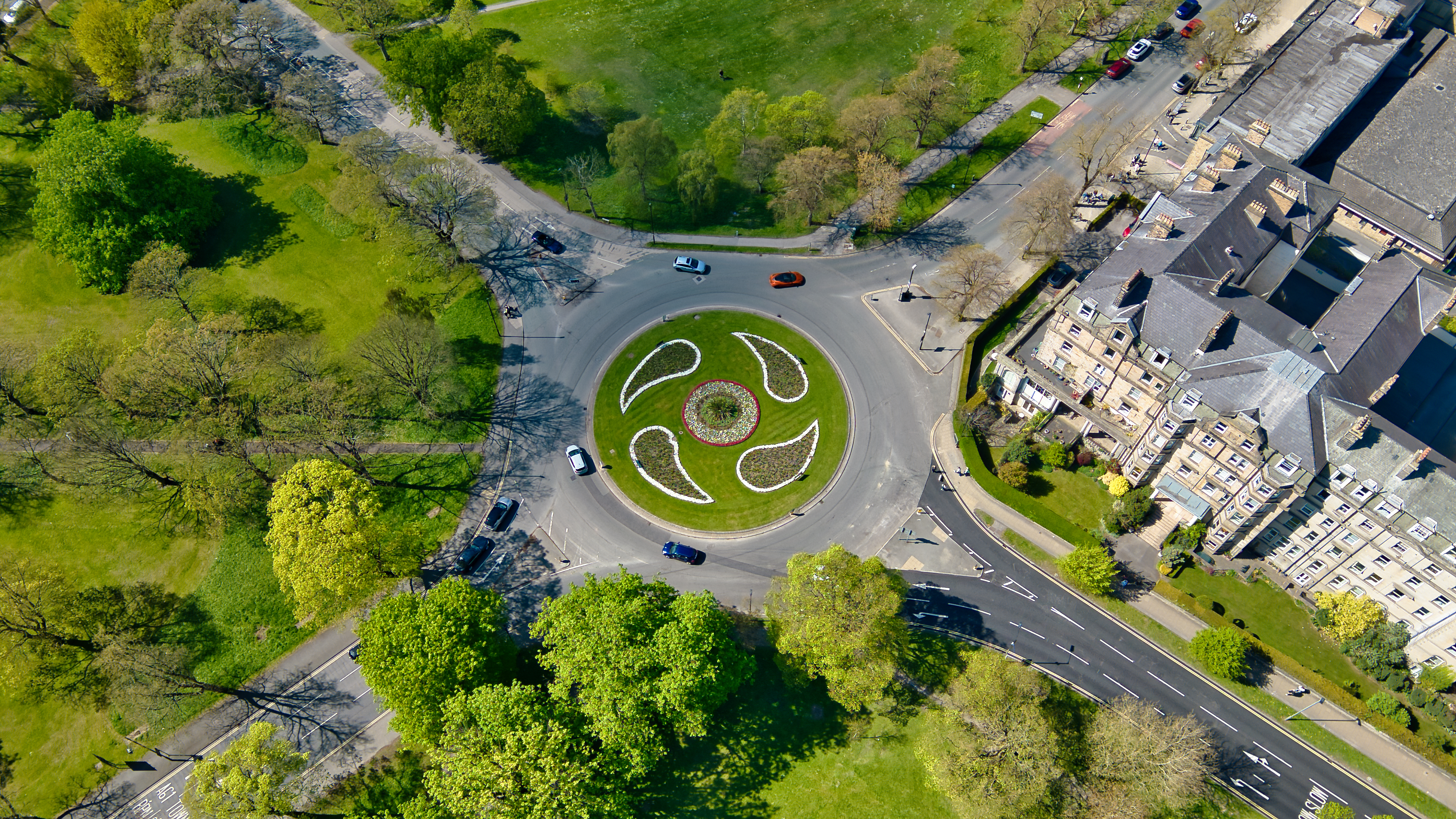 Aerial view of a traffic roundabout with floral designs, surrounded by green space, roads, buildings and scattered cars on a sunny day in Harrogate, UK.