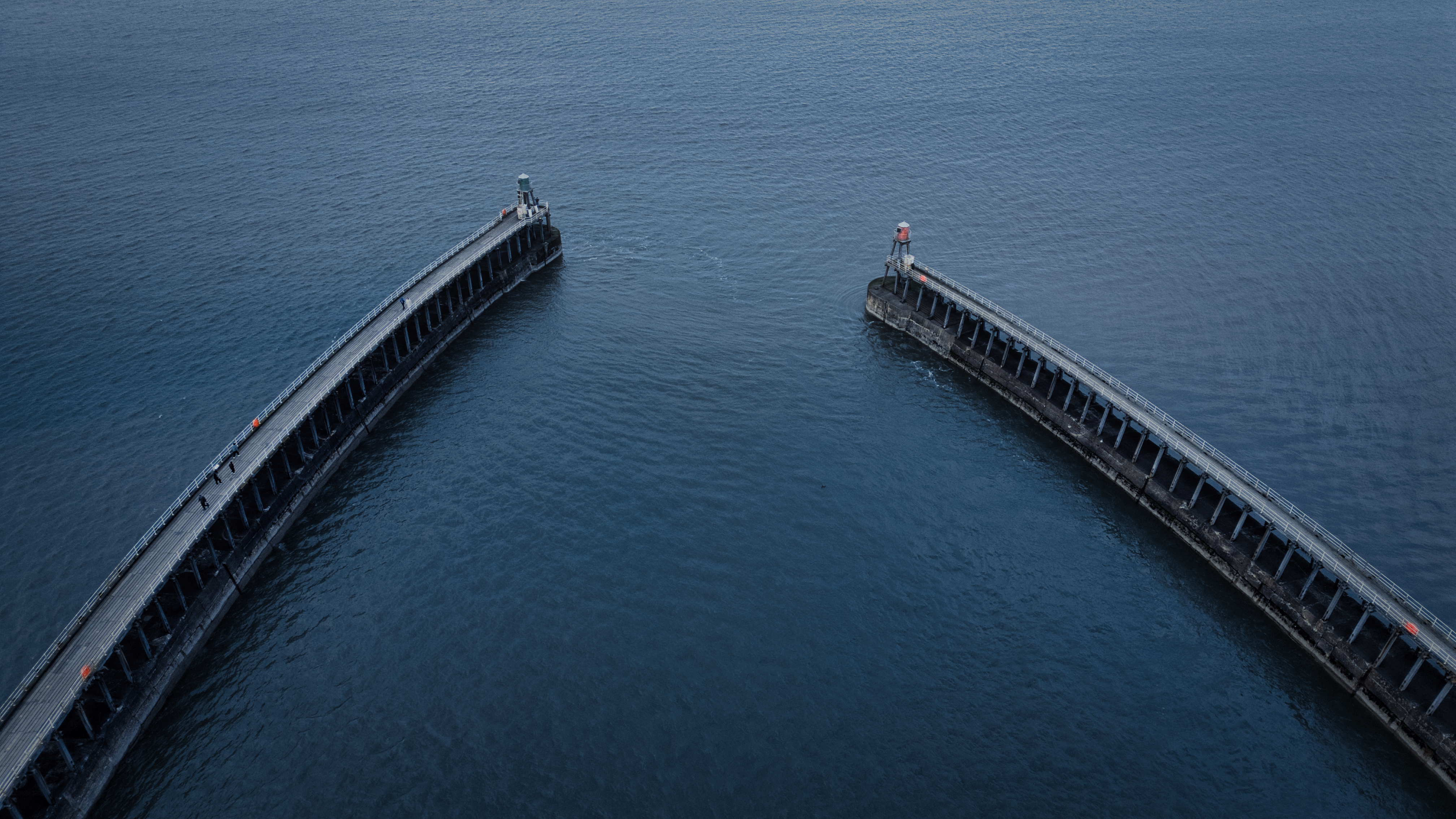 Aerial view of two gray concrete piers extending into a dark blue body of water, with small towers at the ends and figures walking on the pier in Whitby, UK.