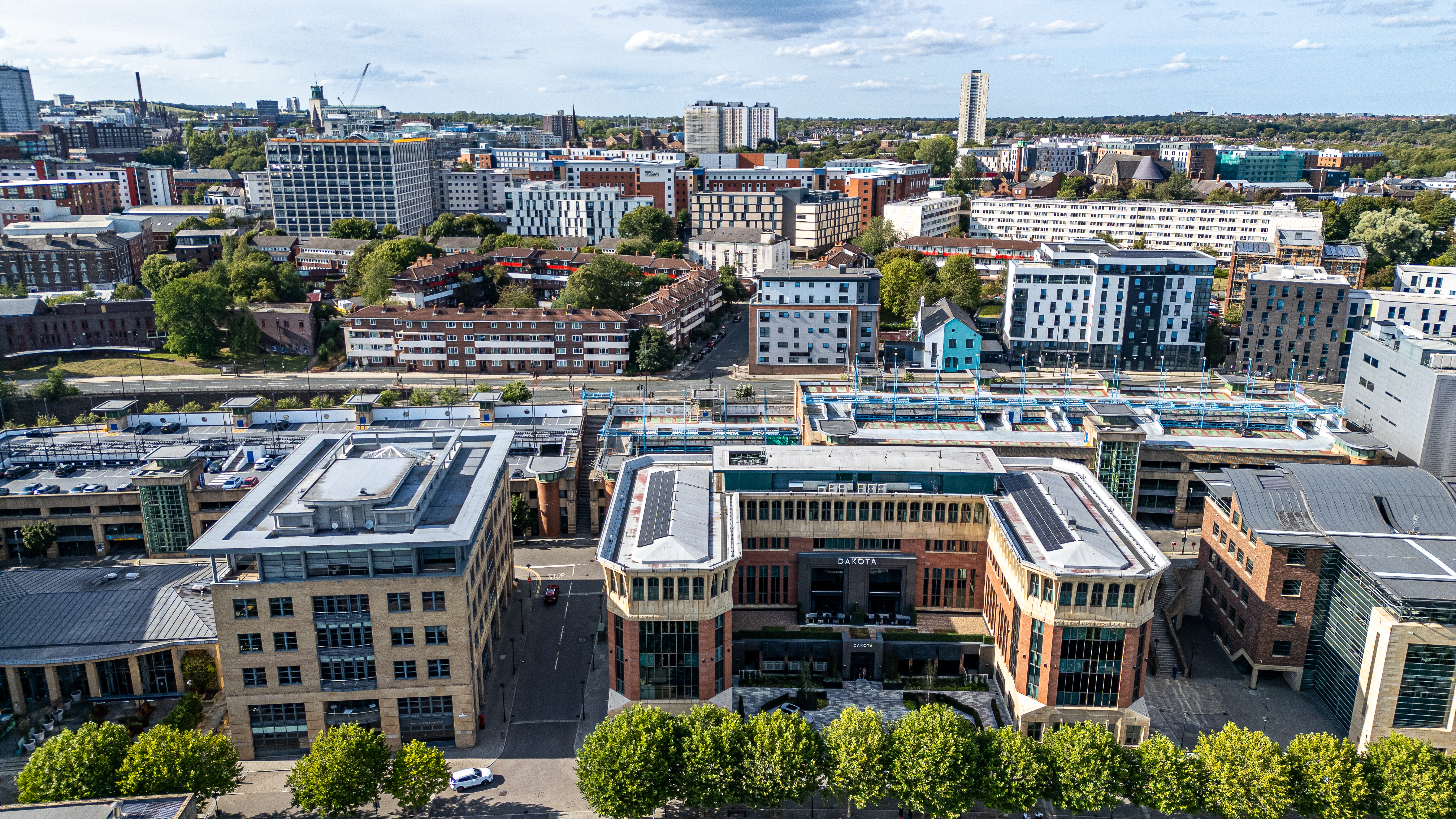 An aerial view of a modern urban cityscape featuring various buildings, trees, and a multi-level parking structure in Newcastle upon Tyne, UK.