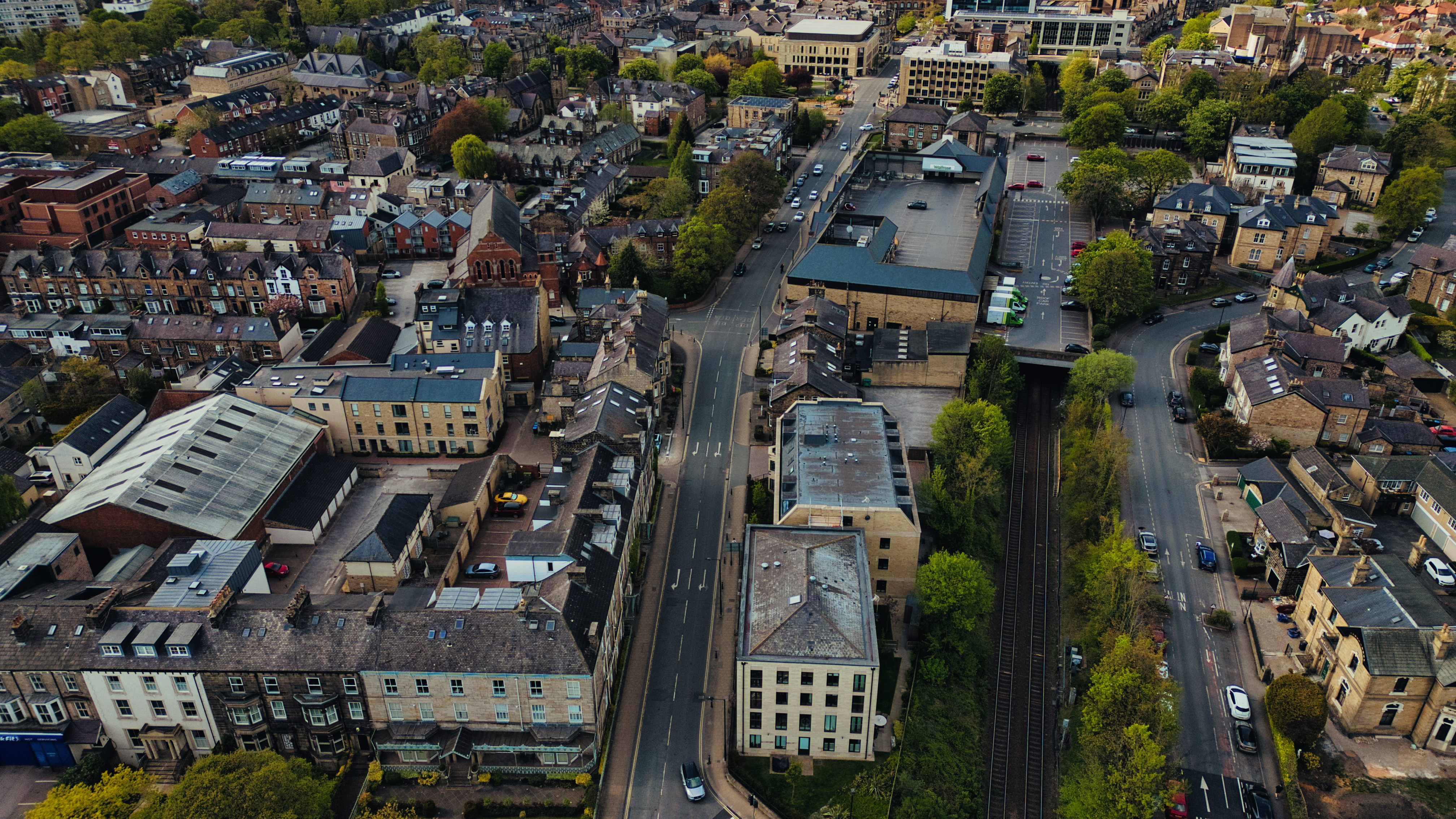 Aerial view of a town featuring roads, buildings, trees, and railway tracks. The composition is slightly desaturated and overcast in Harrogate, UK.