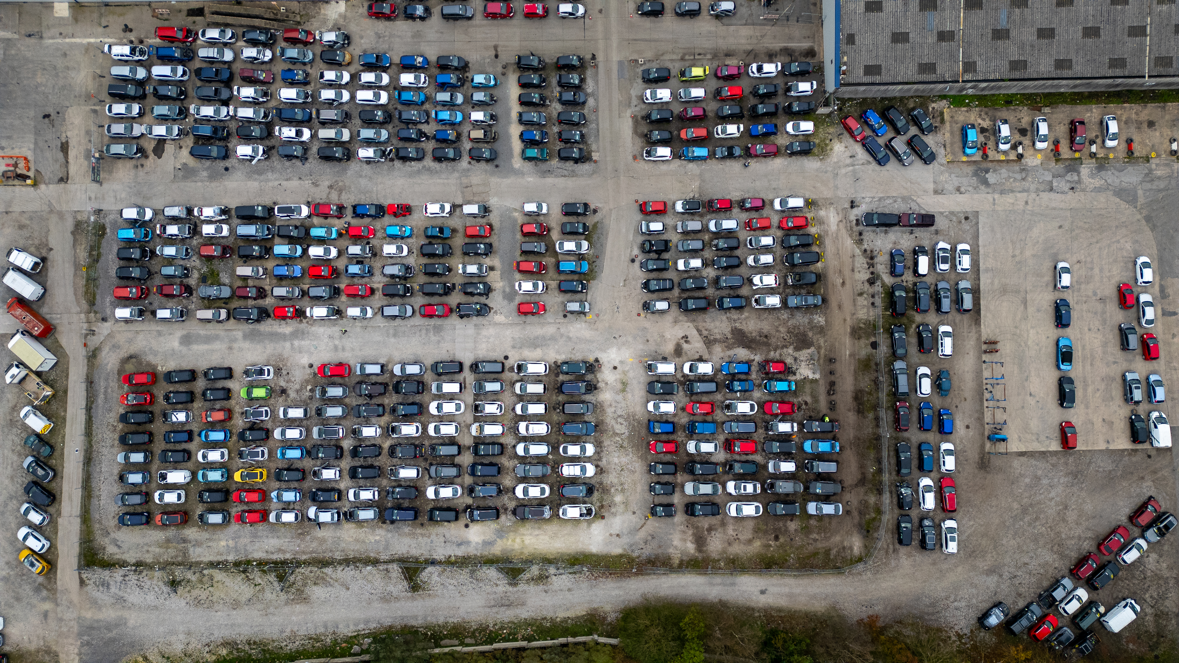 Aerial view of a large outdoor vehicle storage lot filled with numerous cars of various colors and models, parked in organized rows at U-Pull-It York, UK.