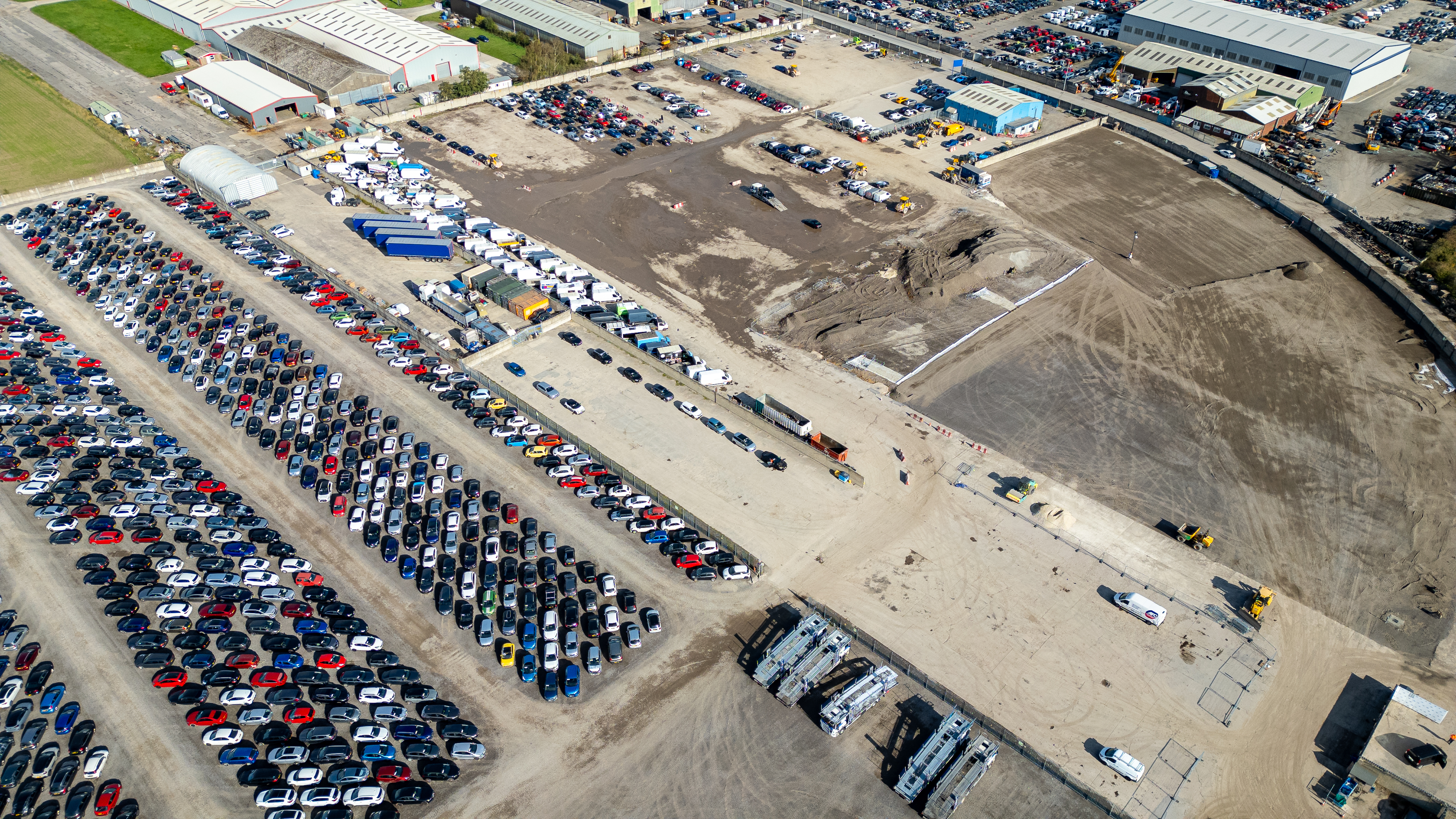 Aerial view of a large outdoor vehicle storage yard, showing rows of cars, trucks, trailers, and industrial buildings under a clear sky at Copart yard, York, UK.