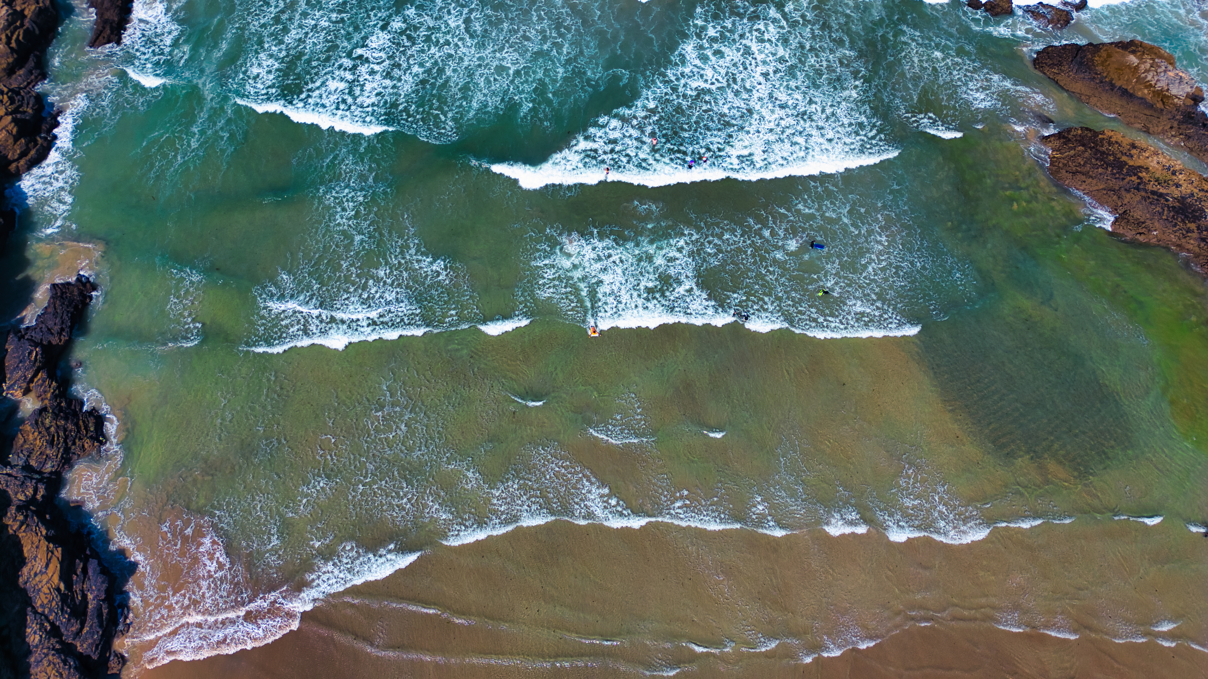 Aerial view of a beach with waves crashing onto the shore. The water is a mix of turquoise and green, with white foam from the waves. The sandy beach is visible, along with rocky formations on the sides.