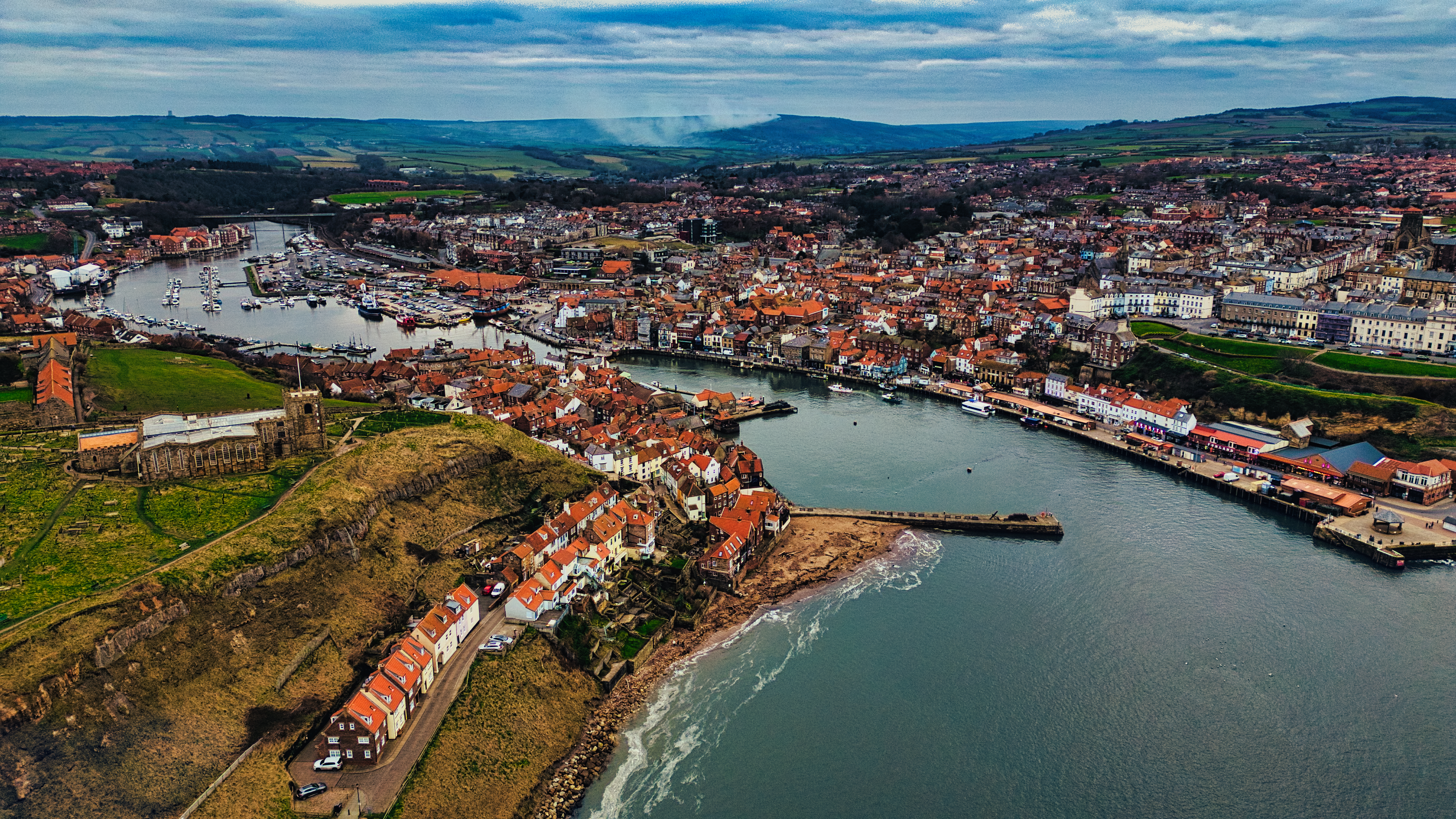 Aerial view of a coastal town bisected by a river, featuring red-roofed buildings, a harbor, and rolling hills in Whitby, UK.
