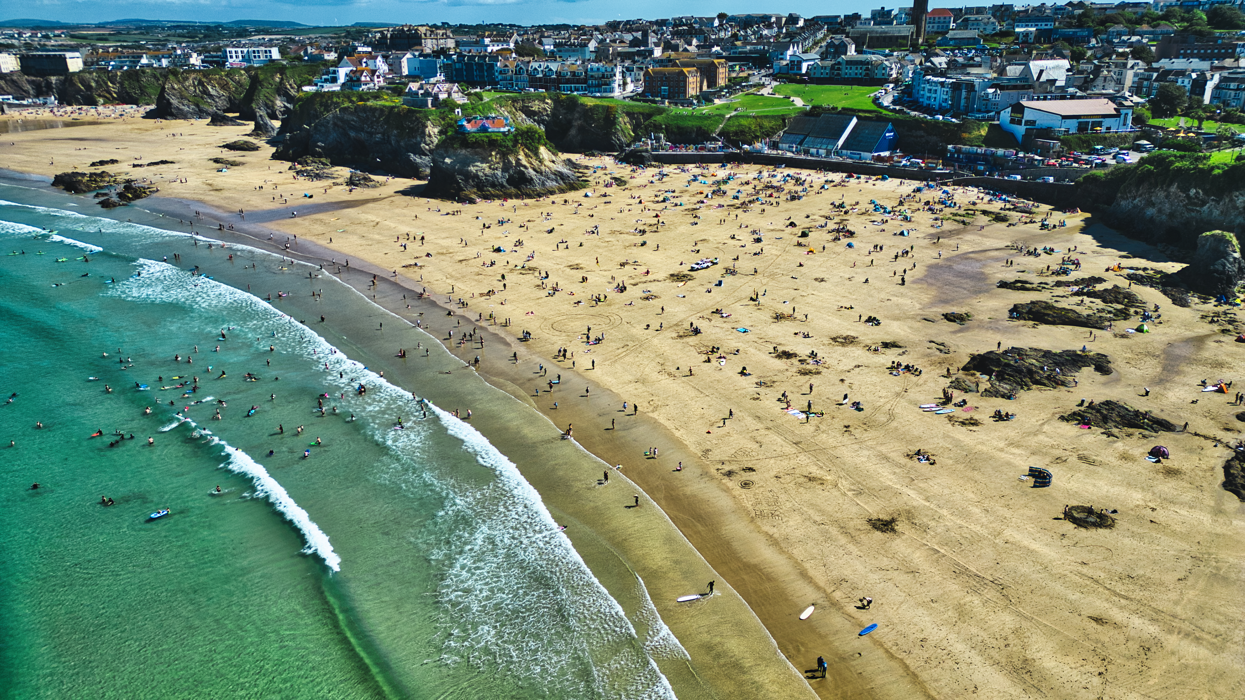 Aerial view of a beach with golden sand and clear turquoise water. Numerous people are enjoying the sun, swimming, and surfing. The coastline features rocky formations and a town in the background with buildings and greenery.