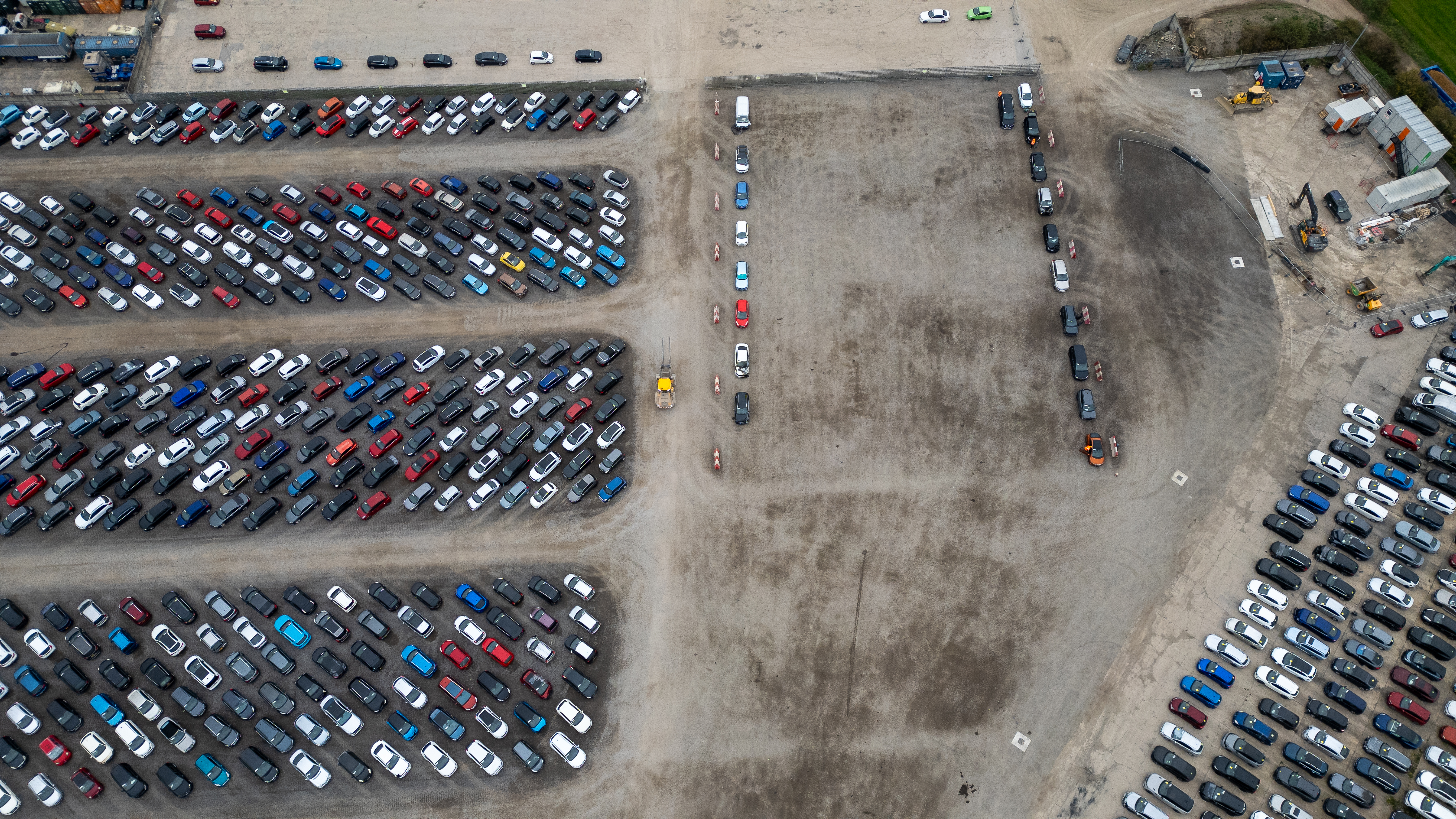 An aerial view shows a large outdoor lot filled with numerous parked cars. The cars are arranged in rows and sections, with some sections dedicated to specific colors at Copart yard, York, UK.
