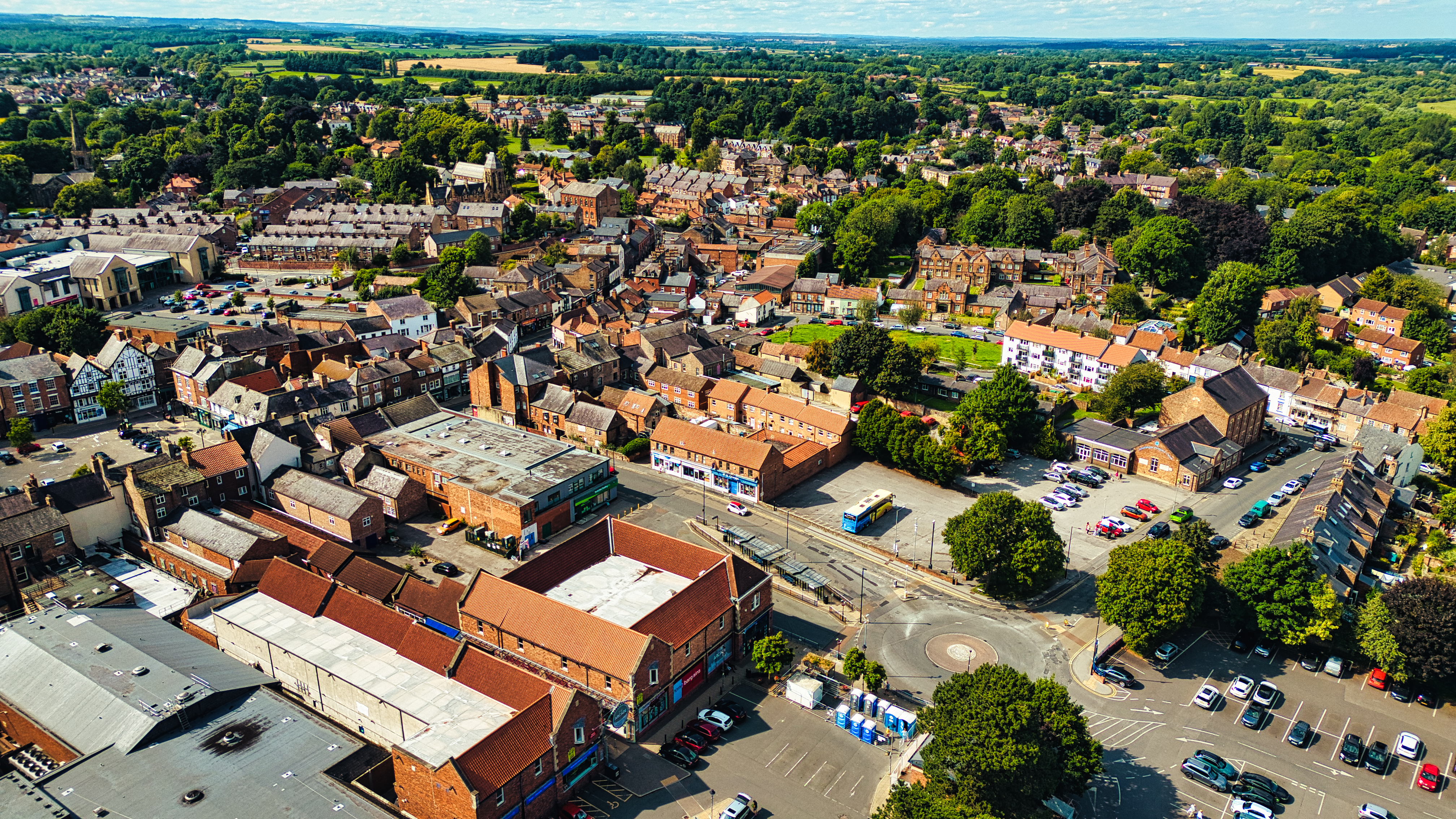 Aerial view of a small town featuring a mix of residential and commercial buildings, green trees, and open fields in the background. The layout includes roads, parking areas, and a variety of architectural styles.