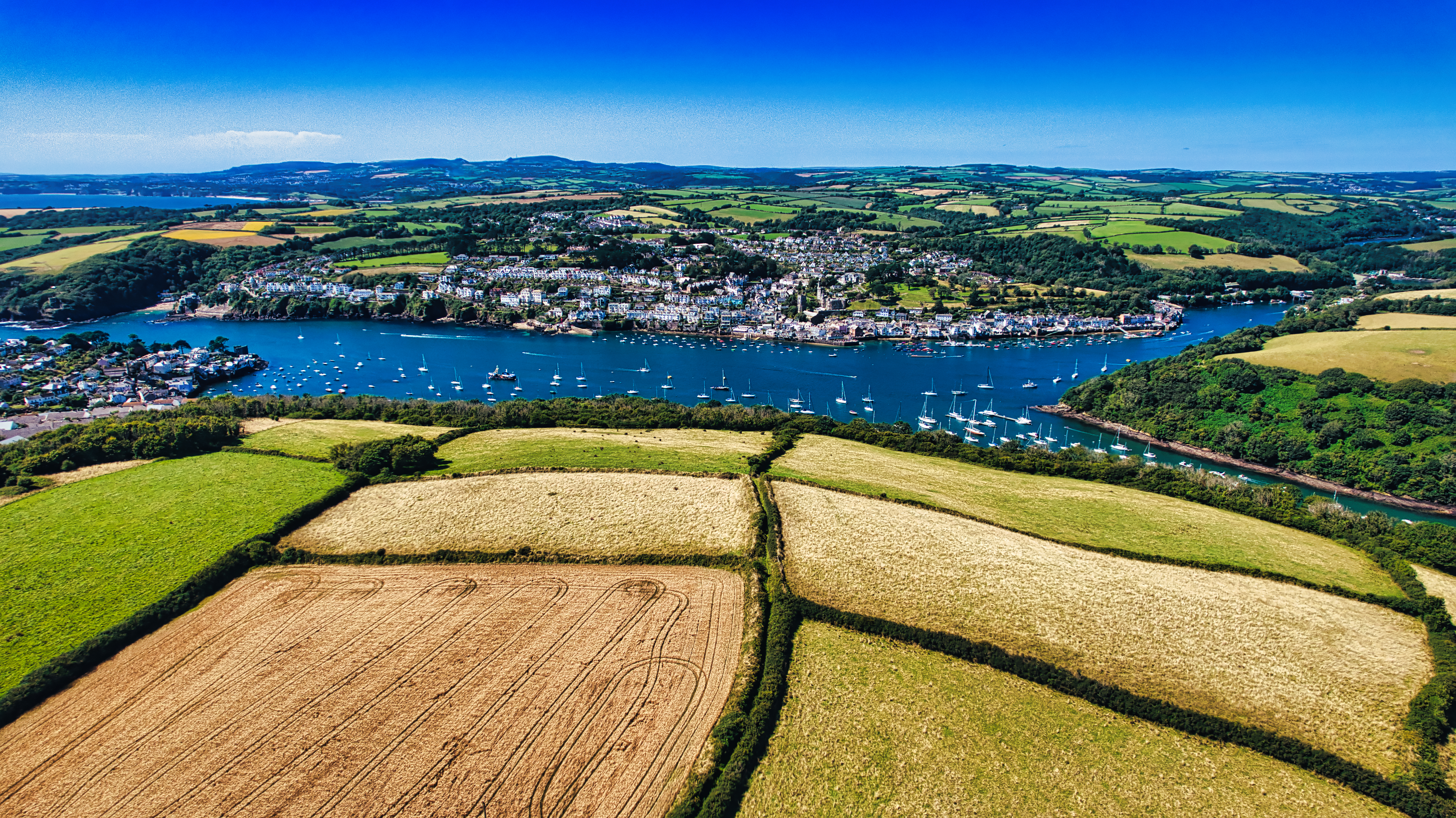 Aerial view of a picturesque coastal town surrounded by lush green hills and fields. The town is nestled along a river estuary, dotted with boats. The landscape features vibrant fields and a clear blue sky, creating a serene and scenic atmosphere.