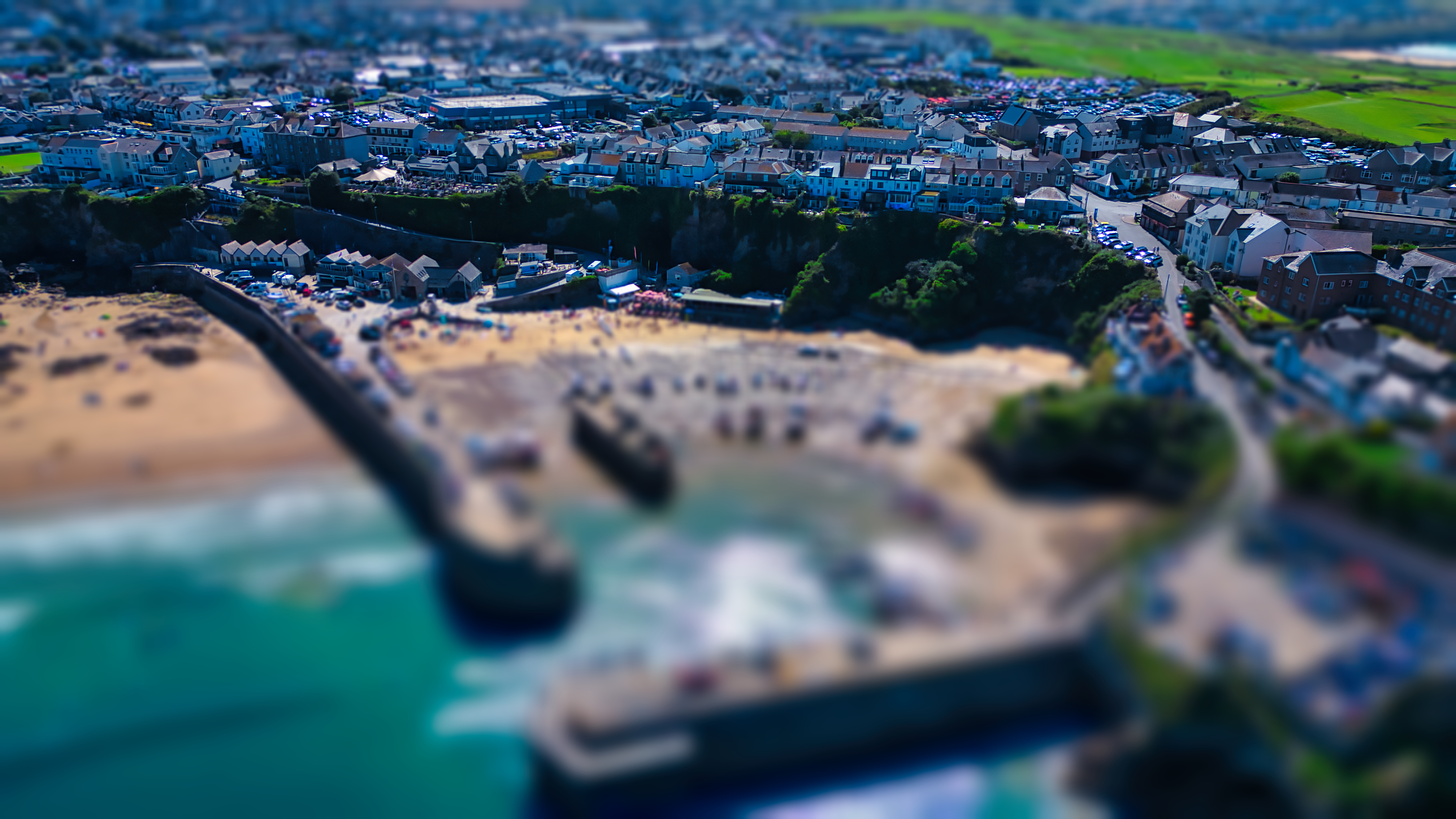 Aerial view of a coastal town with sandy beach, rocky shoreline, and colorful houses. The scene captures beachgoers enjoying the sun, with boats in the water and green fields in the background.