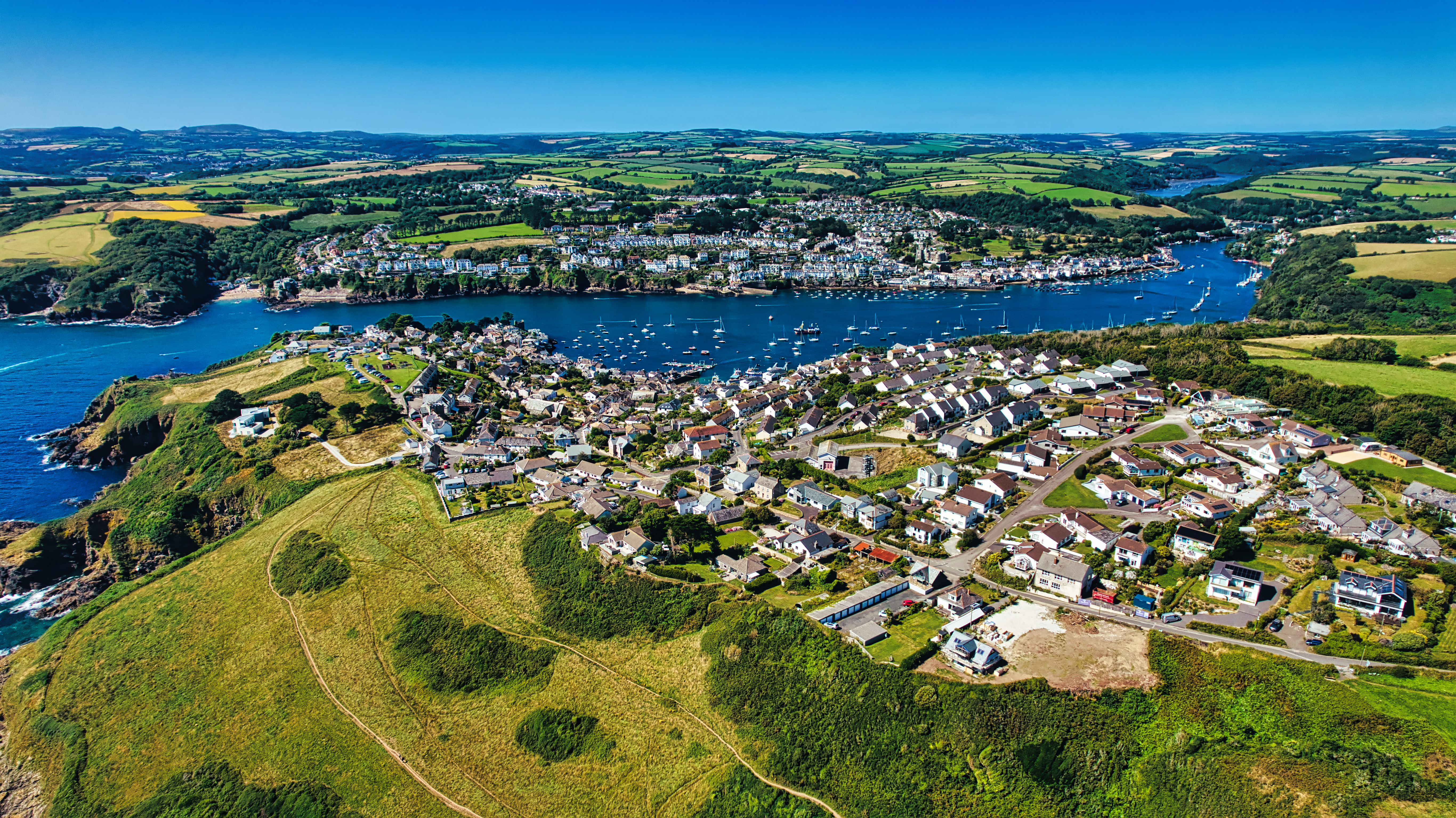 Aerial view of a picturesque coastal town surrounded by lush green hills and a serene harbor filled with boats. The town features a mix of residential homes and scenic landscapes, showcasing the beauty of nature and architecture.
