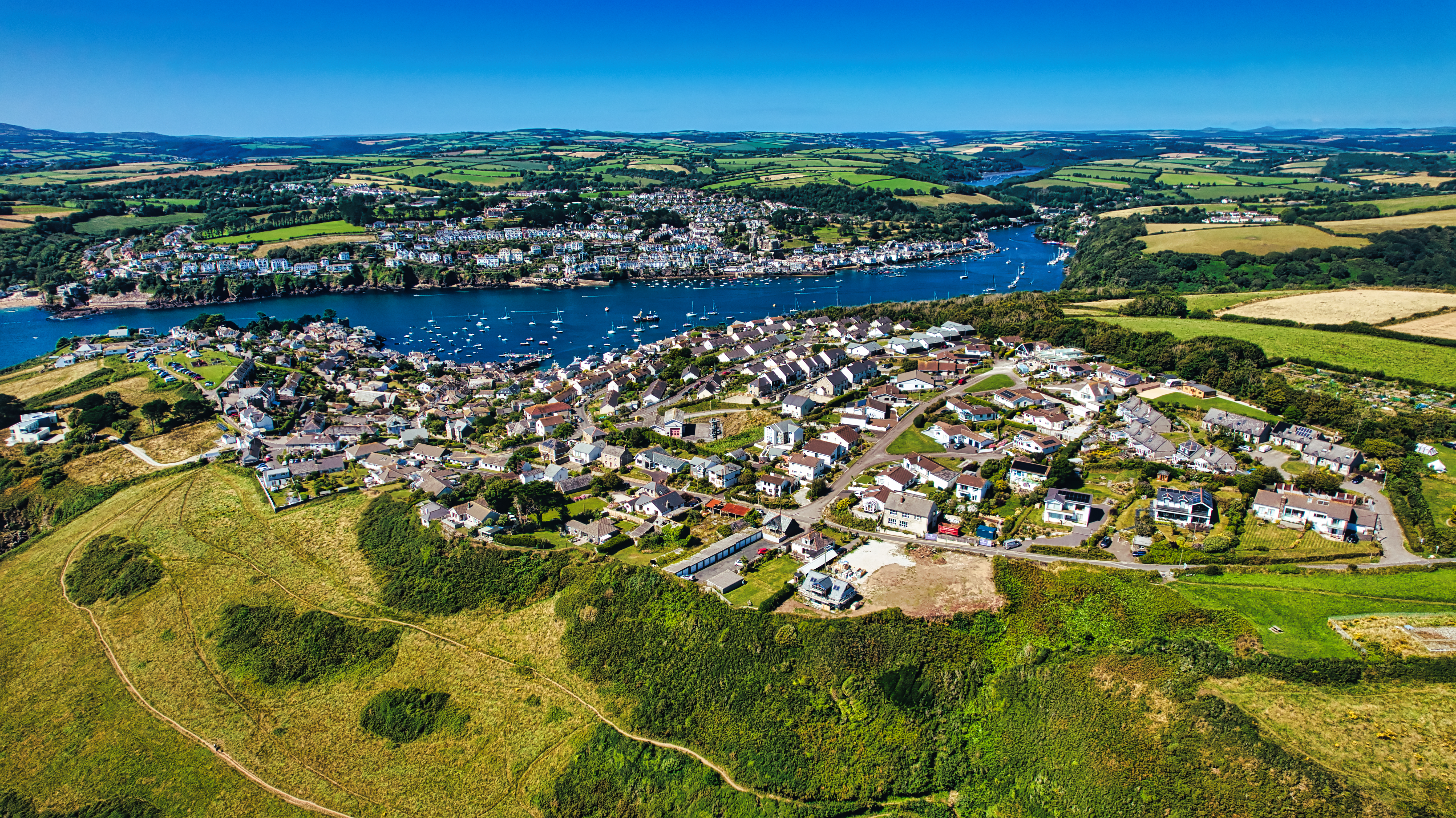 Aerial view of a picturesque coastal village surrounded by lush green hills and a river. The village features modern houses and a marina with boats. The landscape is vibrant under a clear blue sky, showcasing the beauty of nature and residential life.