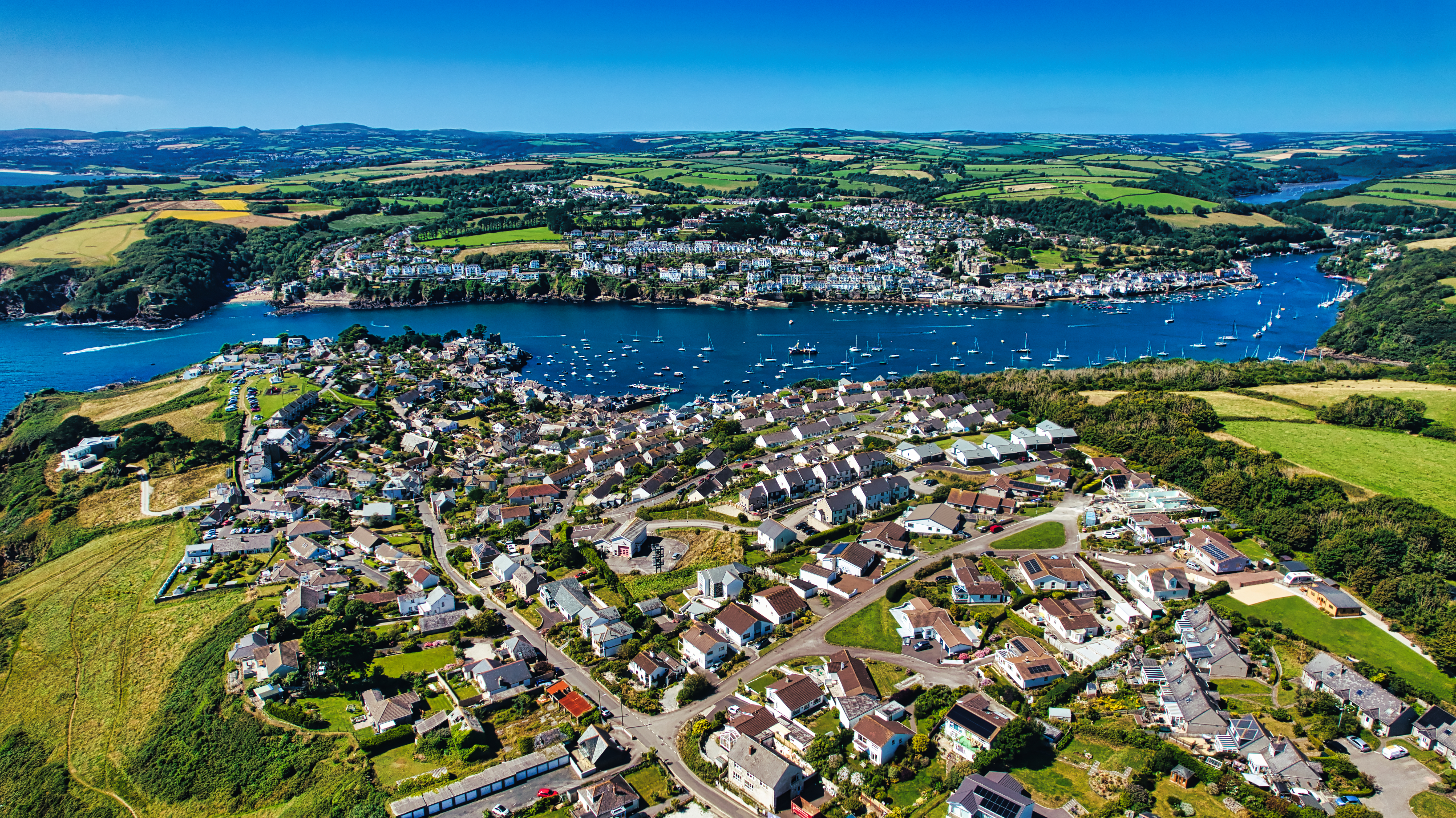 Aerial view of a picturesque coastal village surrounded by lush green hills and a river. The village features a mix of residential homes and boats in the water, with a clear blue sky overhead.