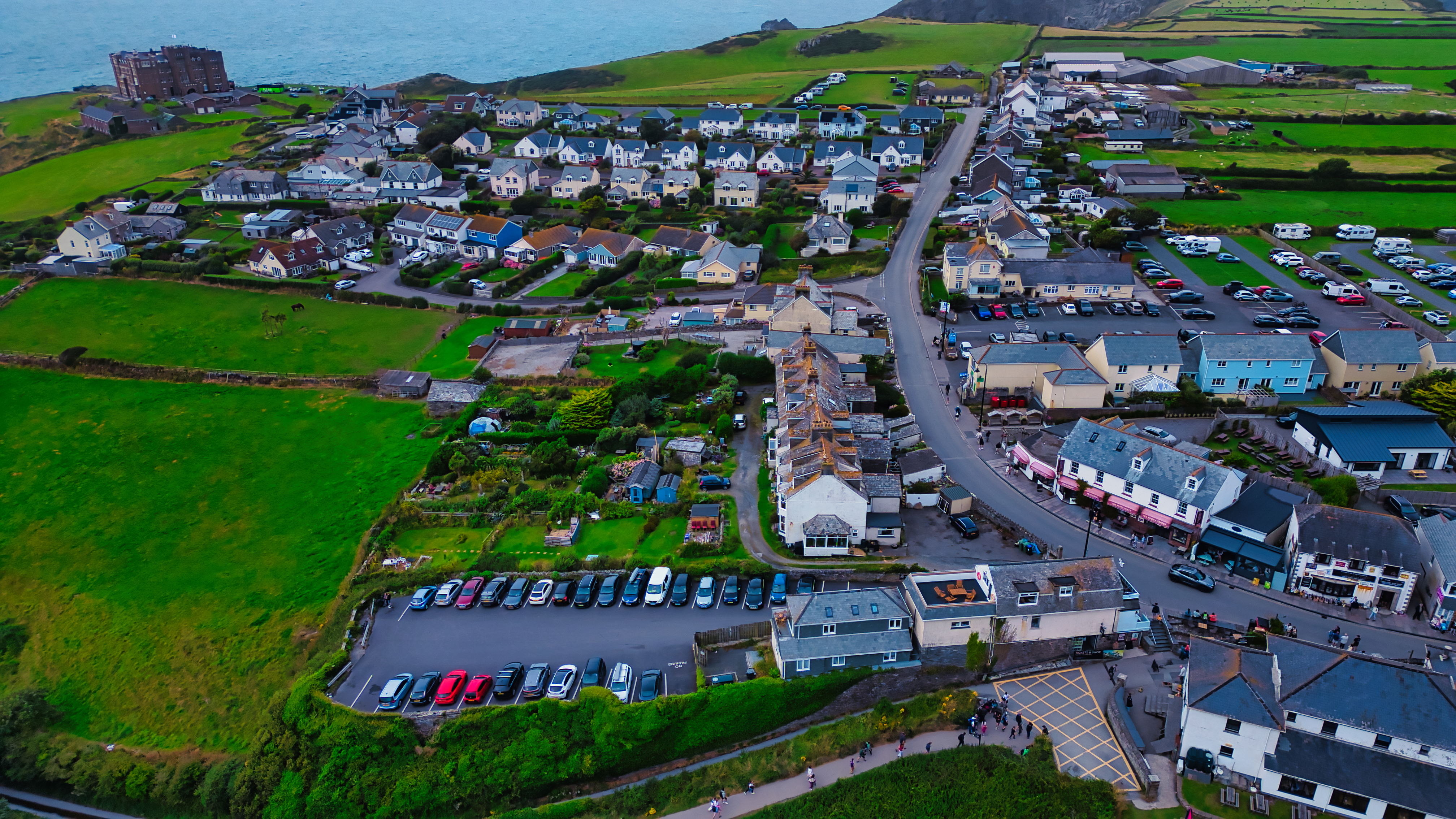 Aerial view of a coastal village with a mix of residential and commercial buildings. The landscape features green fields, parked cars, and a road leading to the sea. The ocean is visible in the background, with a few boats on the water.