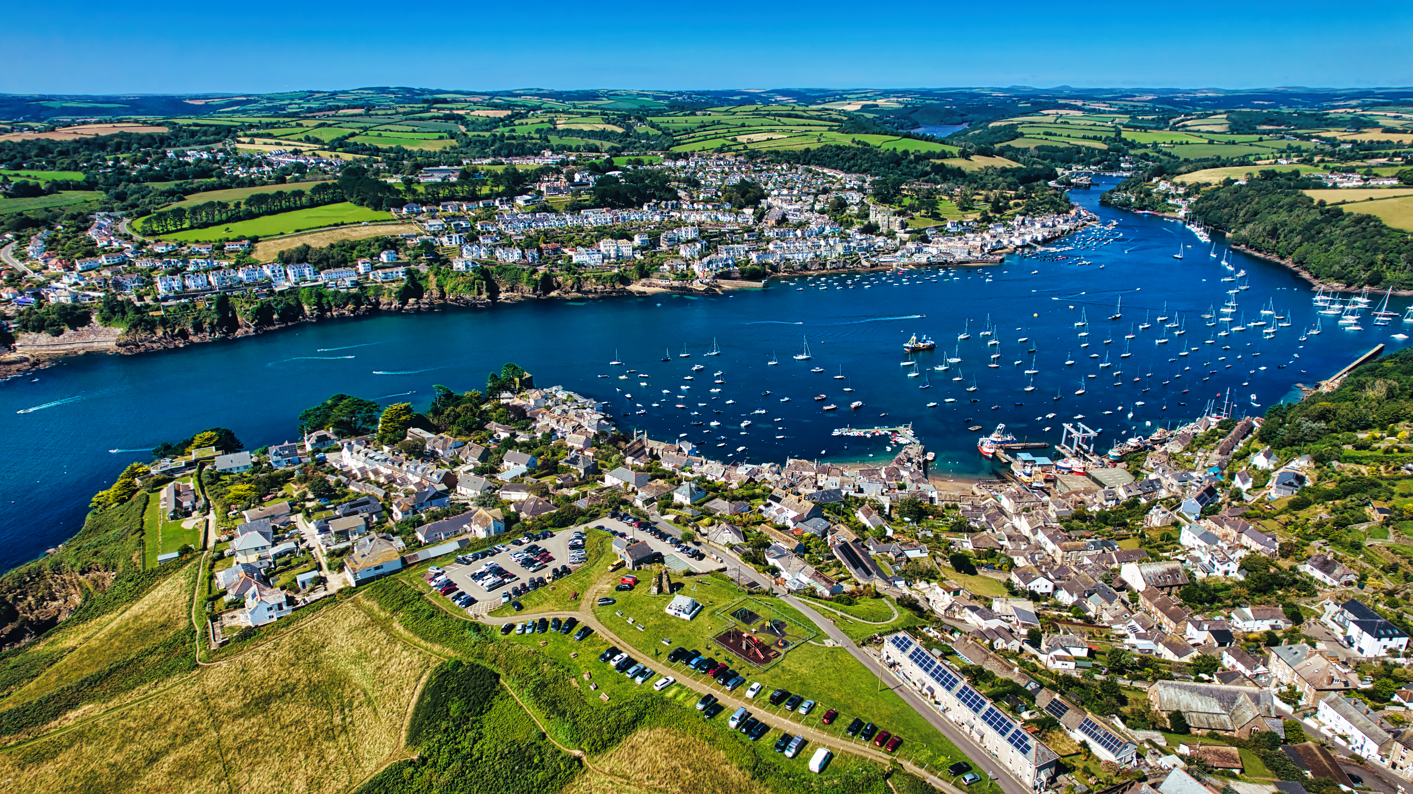 Aerial view of a picturesque coastal village with a marina, surrounded by lush green hills and fields. The scene features a river filled with boats, residential buildings, and a clear blue sky.