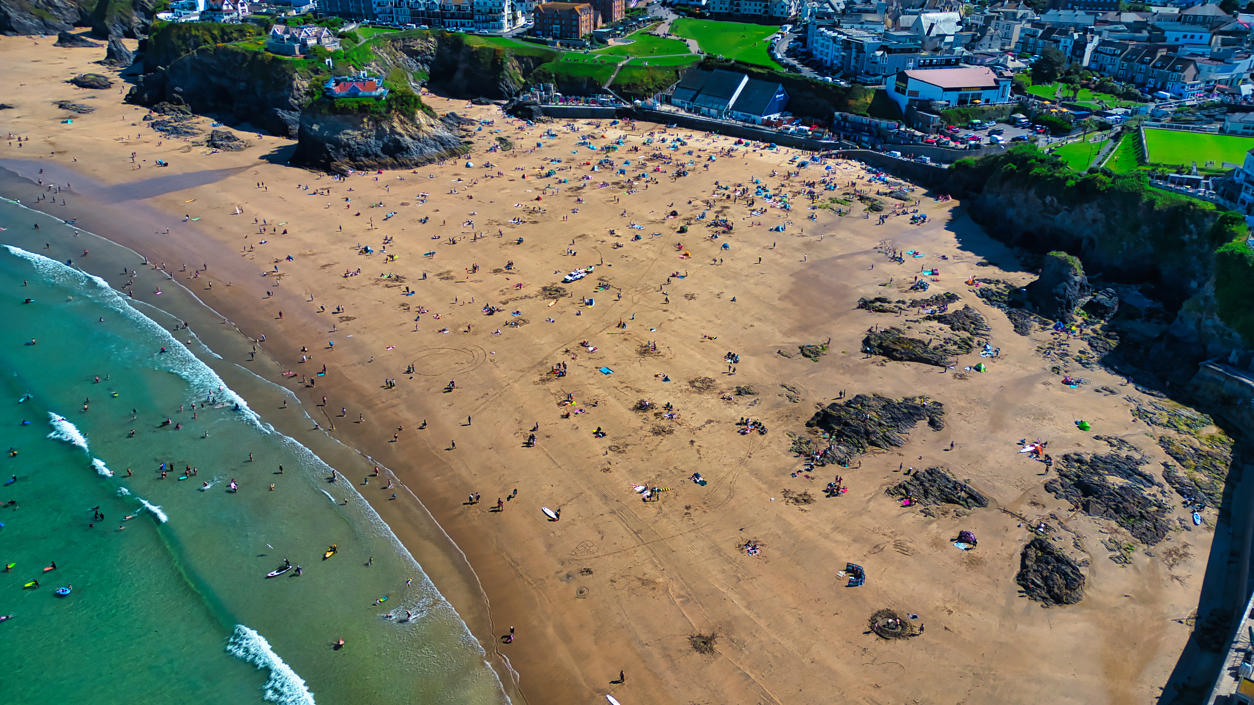 Aerial view of a sandy beach crowded with sunbathers and surfers. The beach features rocky formations and gentle waves lapping at the shore. In the background, there are buildings and green areas, indicating a coastal town.