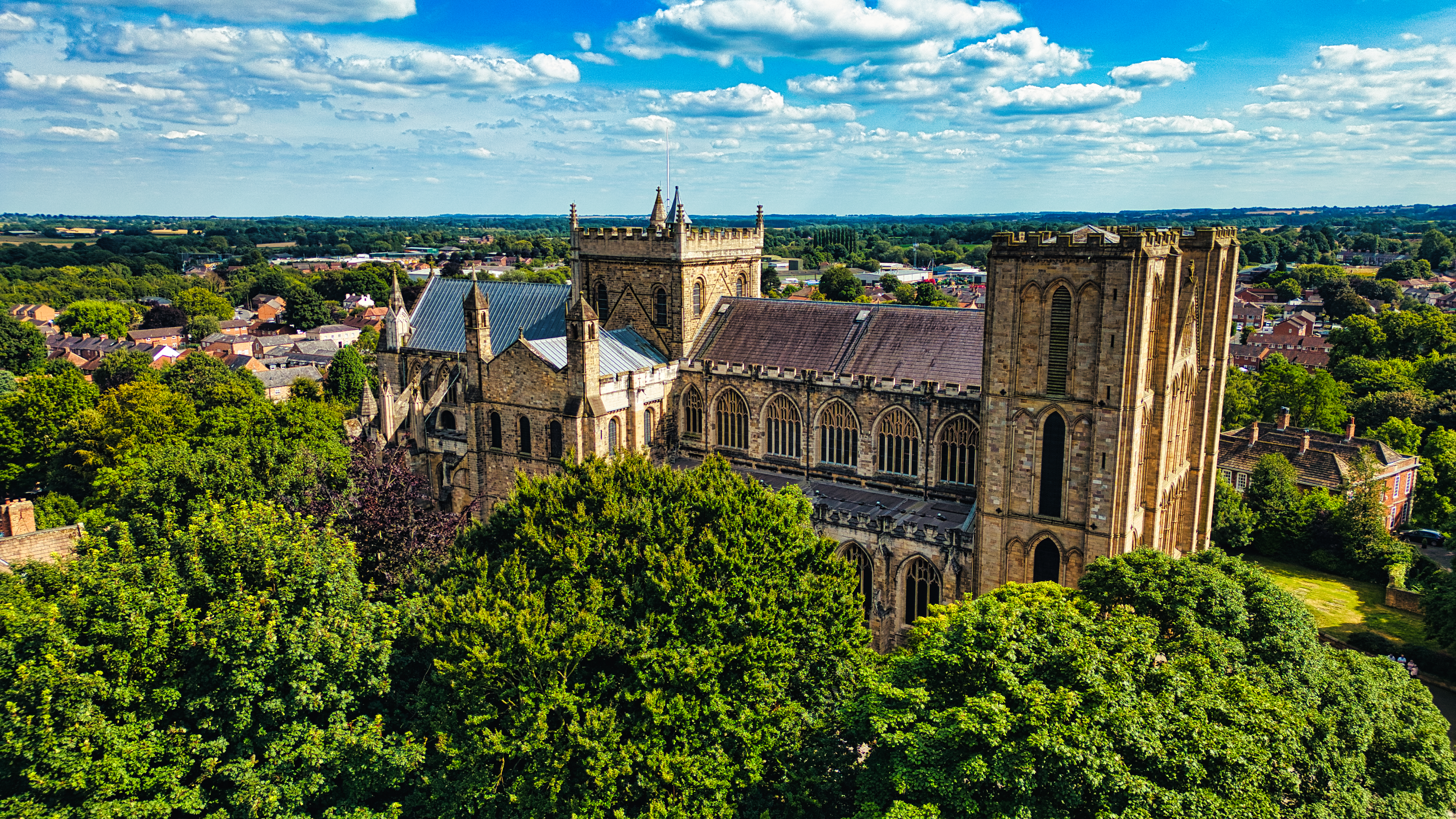 Aerial view of a historic cathedral surrounded by lush greenery and a scenic landscape. The sky is bright with fluffy clouds, and the town is visible in the background, showcasing a blend of nature and architecture.