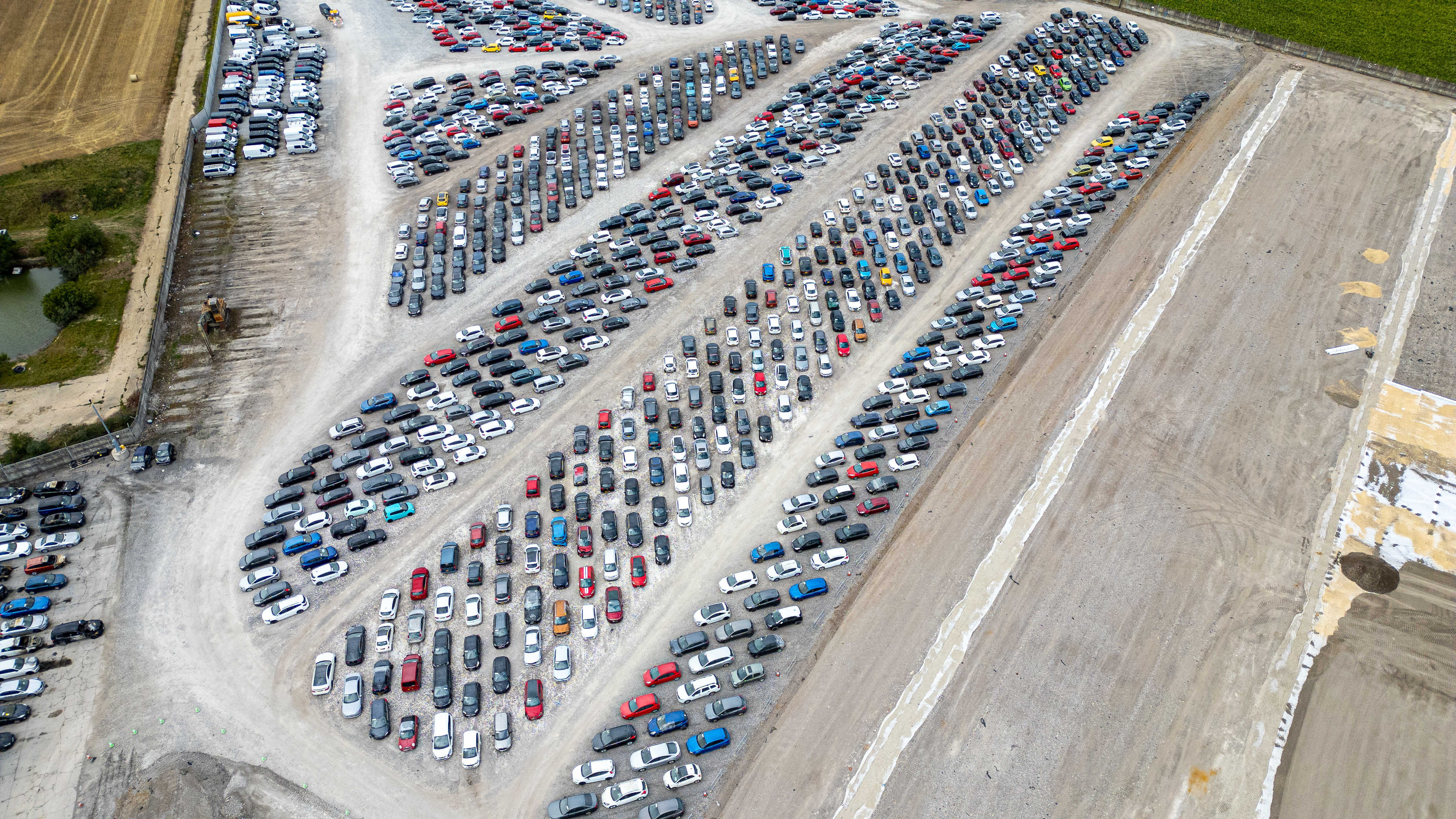 An aerial view shows a vast car impound lot, with thousands of vehicles neatly parked in rows on a gravel surface, bordered by fields and construction areas at Copart yard in York, UK.