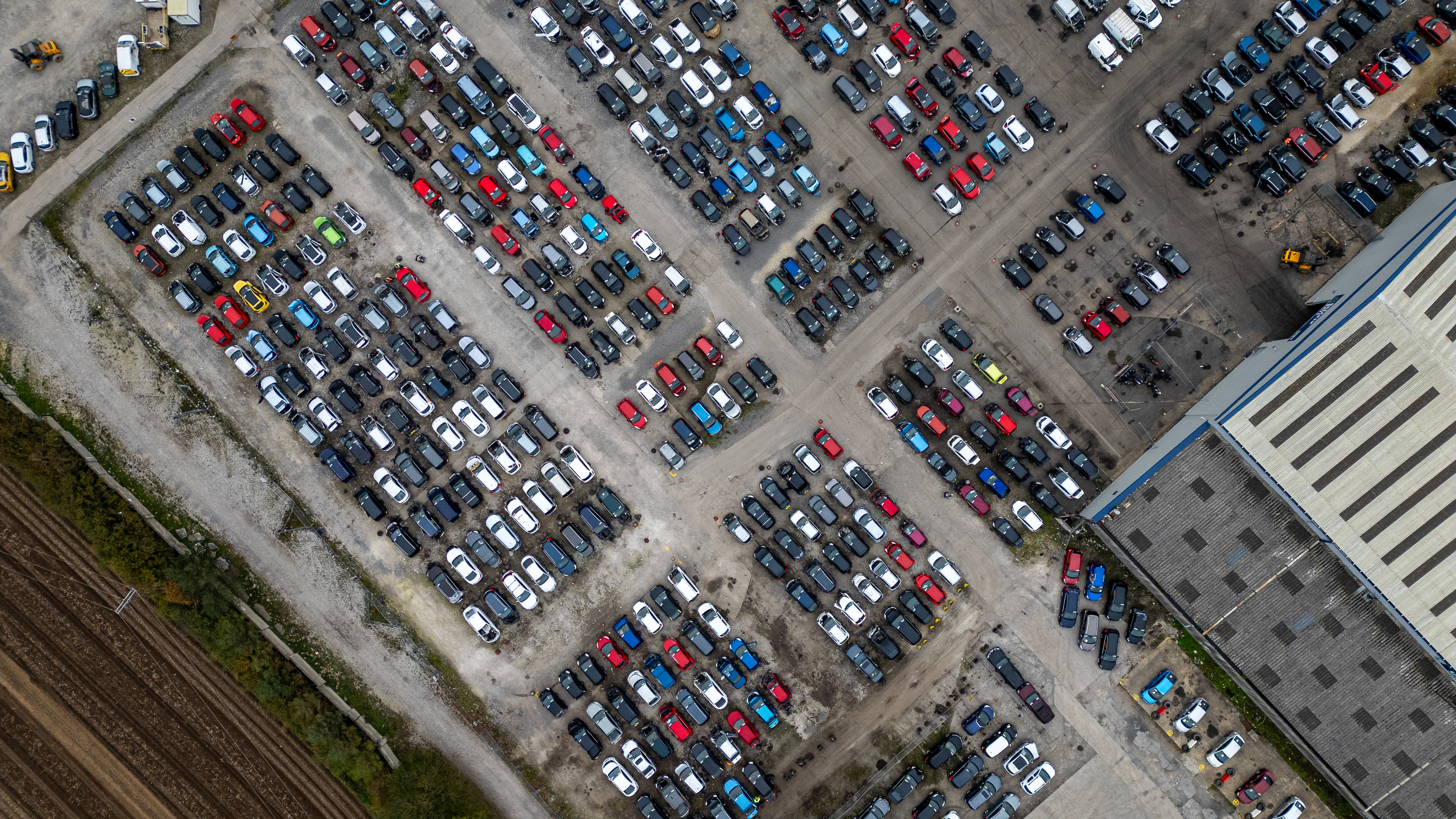 An aerial view shows a large car park filled with many parked vehicles, a warehouse, and surrounding agricultural land at U-Pull-It York, UK.