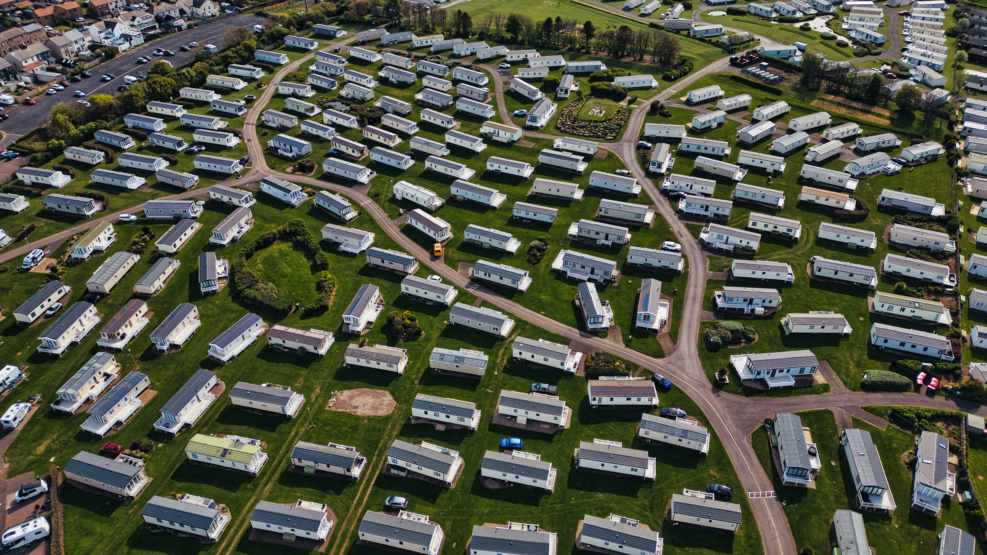 Aerial view shows rows of mobile homes on green lawns intersected by winding asphalt roads, adjacent to a residential area and fields in Seahouses village, UK.