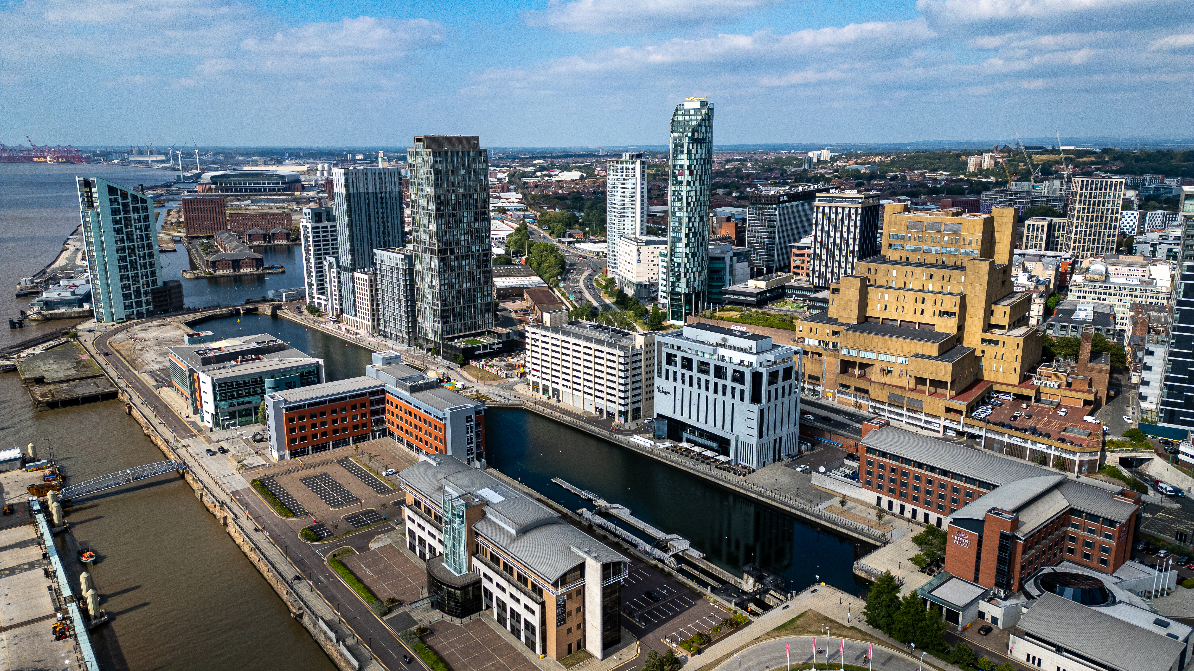 An aerial view of a modern city with skyscrapers, waterfront buildings, and a canal, under a bright blue sky with scattered clouds in Liverpool, UK.