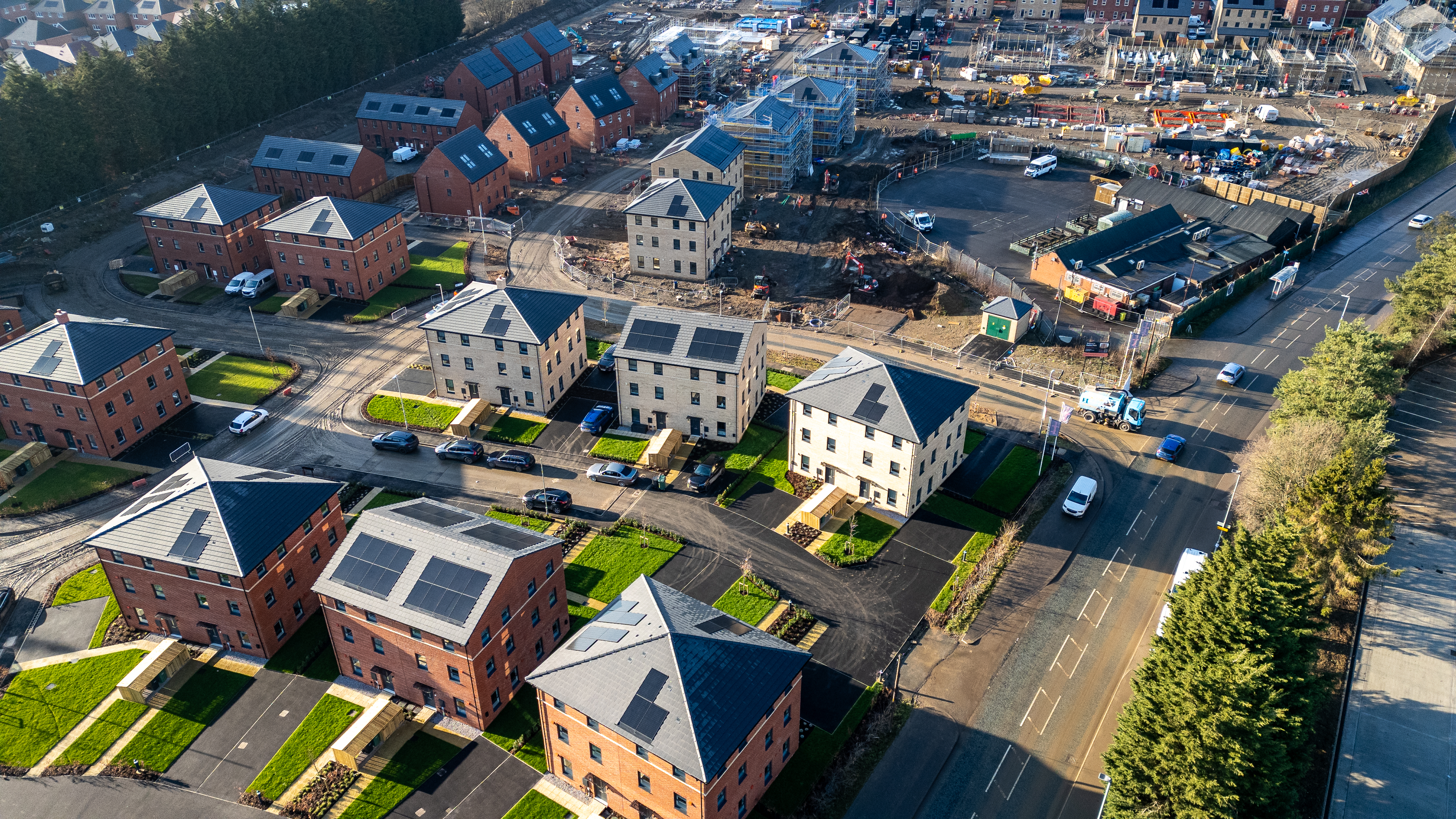 Aerial view of a new housing development with brick and light-colored buildings, some with solar panels, and ongoing construction in the background at Desire by Strata Homes in Leeds, UK.