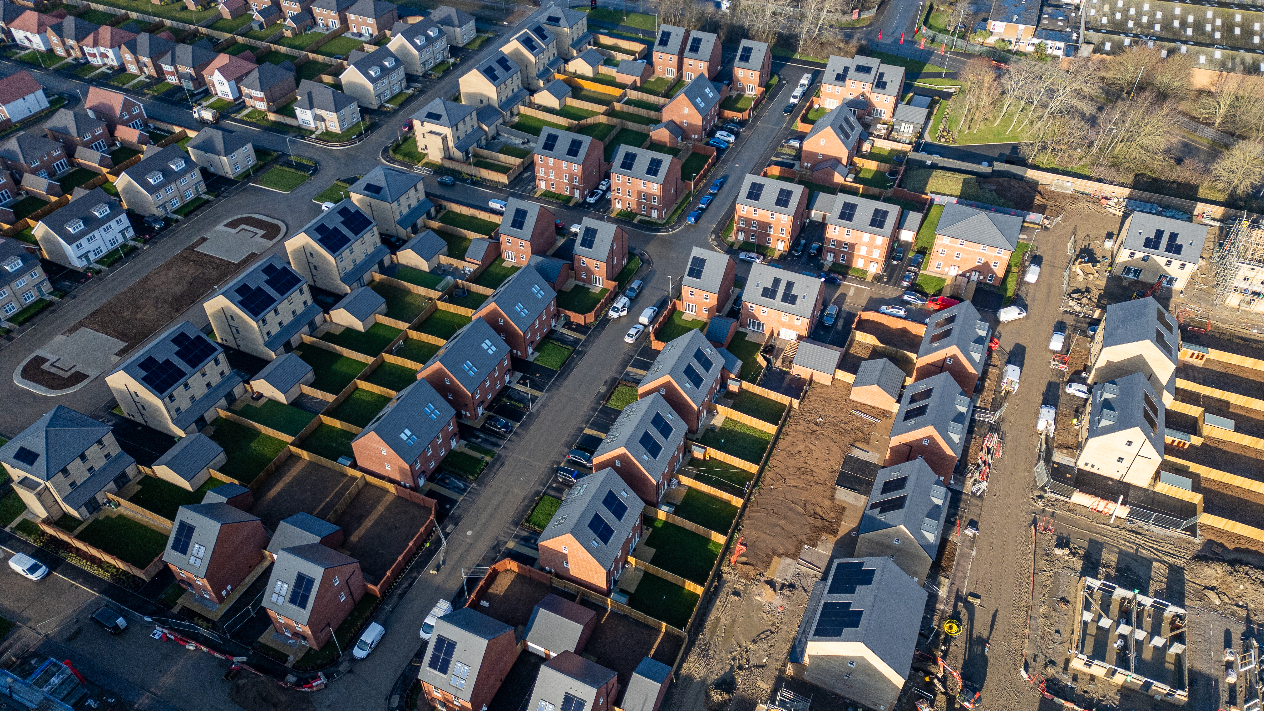 Aerial view of a suburban development showing residential houses with solar panels, roads, gardens, and ongoing construction at Desire by Strata Homes in Leeds, UK.