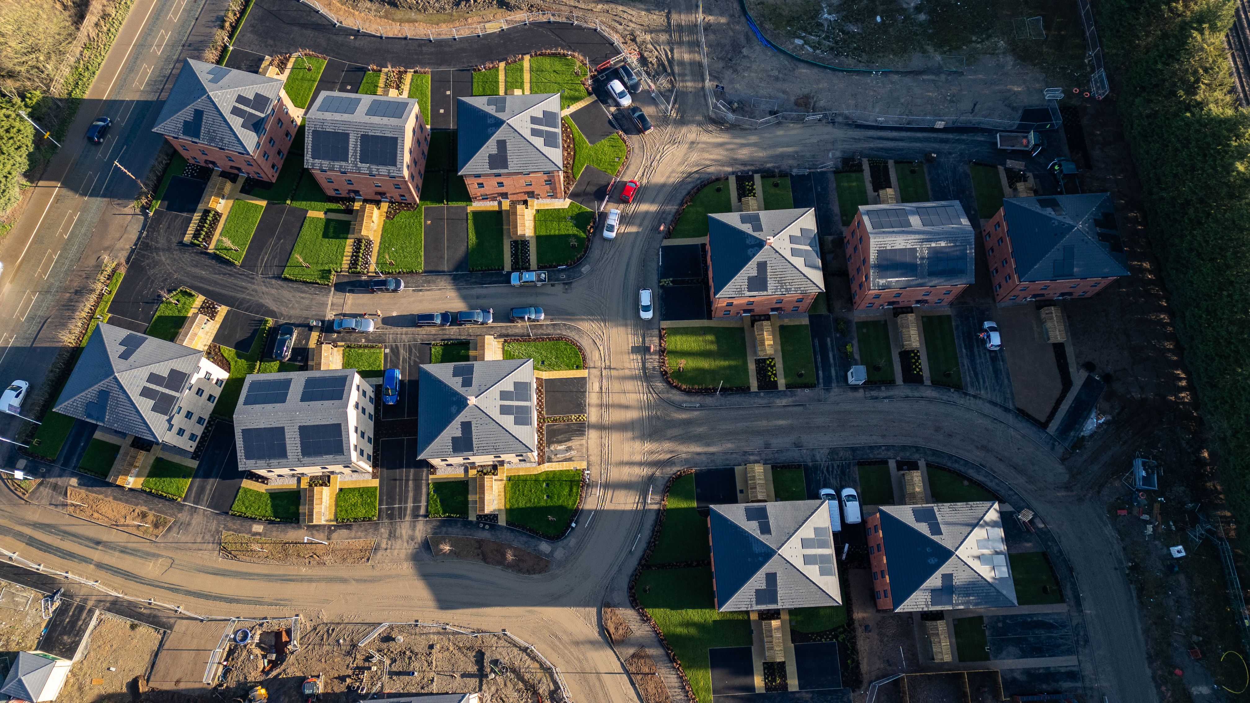 Aerial view of a newly built housing development featuring brick and light-colored houses with solar panels on their roofs, surrounded by green lawns and asphalt roads at Desire by Strata Homes in Leeds, UK.