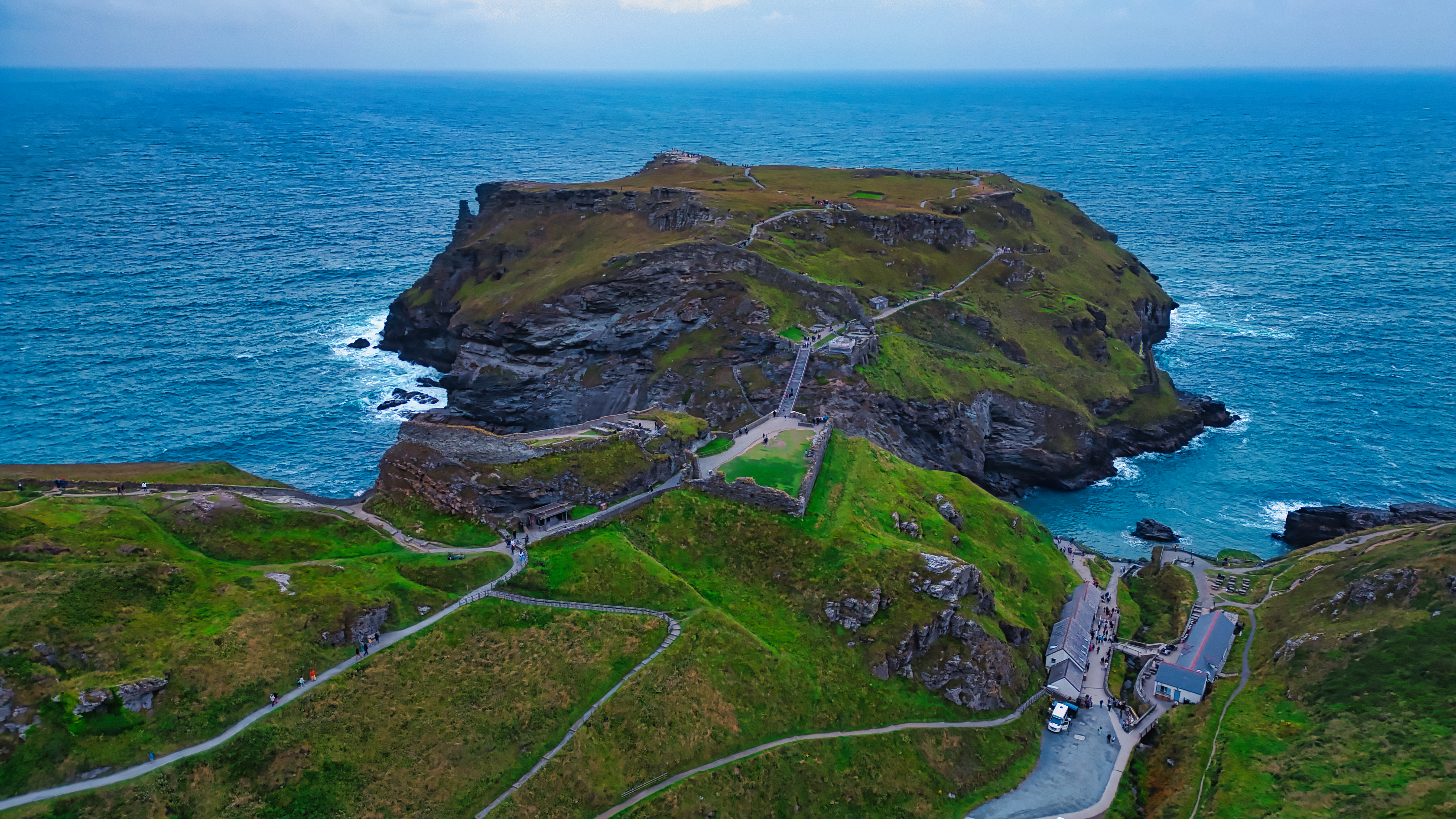 Aerial view of a rugged coastal landscape featuring a rocky island surrounded by turquoise waters. The island has winding paths and green hills, with a small building at the base. The sky is overcast, adding a dramatic effect to the scenery.