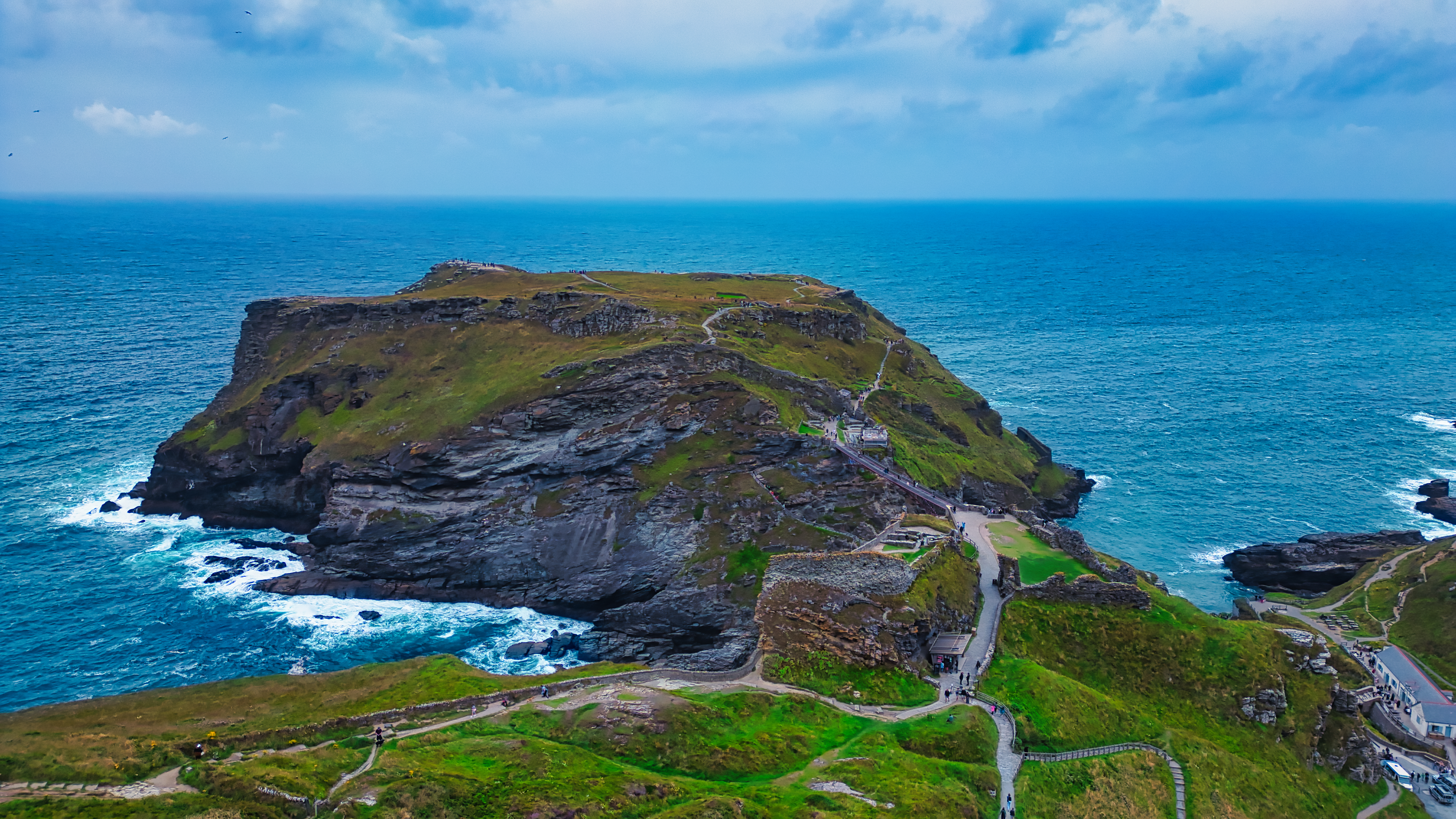 Aerial view of a rugged coastal landscape featuring a rocky island surrounded by turquoise waters. The island has walking paths and grassy areas, with waves crashing against the cliffs. The sky is partly cloudy, adding to the dramatic scenery.