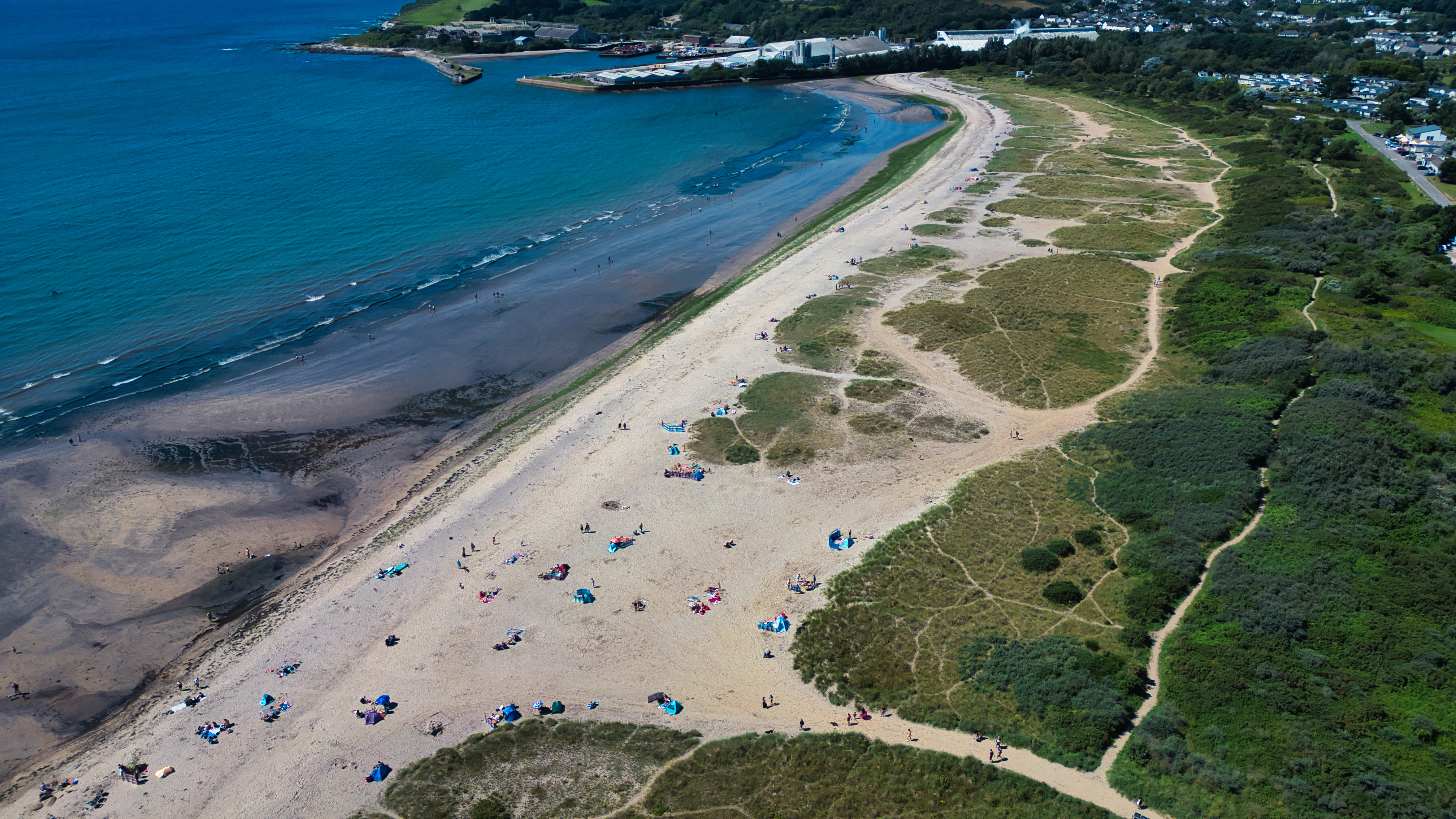 Aerial view of a sandy beach with scattered people enjoying the sun. The beach is bordered by lush green vegetation and a calm blue sea. In the background, there are buildings and a coastal landscape.