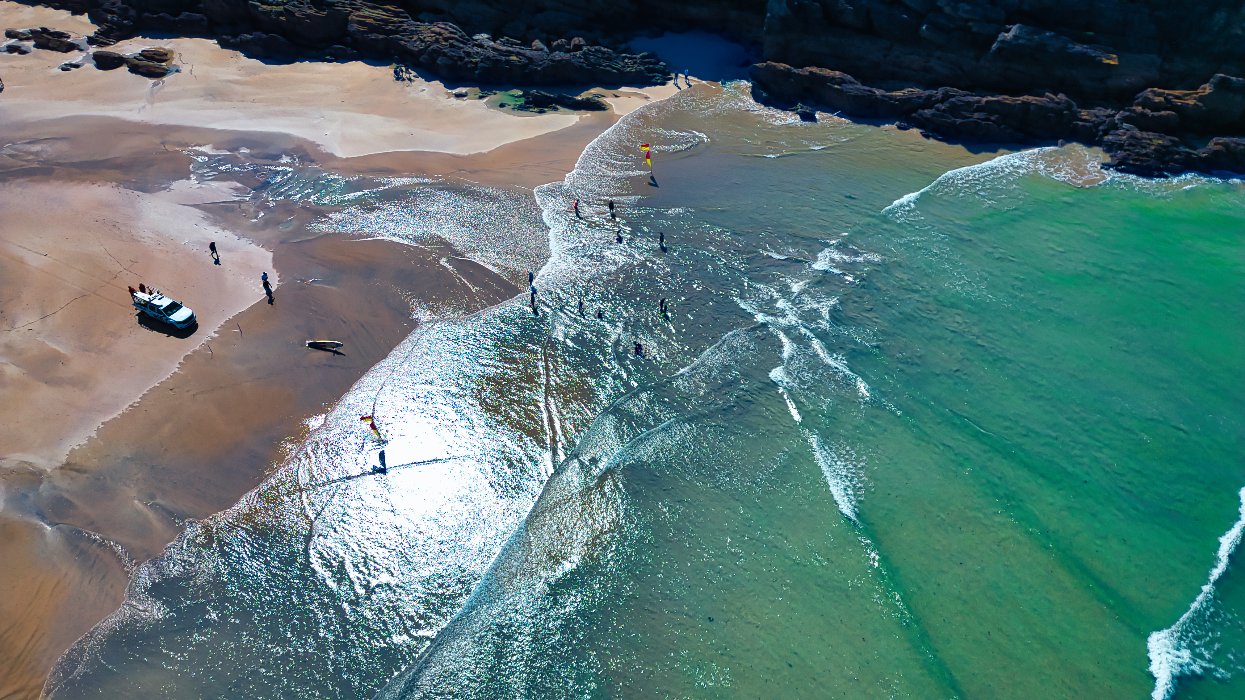 Aerial view of a beach with golden sand and turquoise waters. People are walking along the shore and a small boat is anchored nearby. The sunlight reflects off the water, creating a shimmering effect. Rocky cliffs are visible in the background.