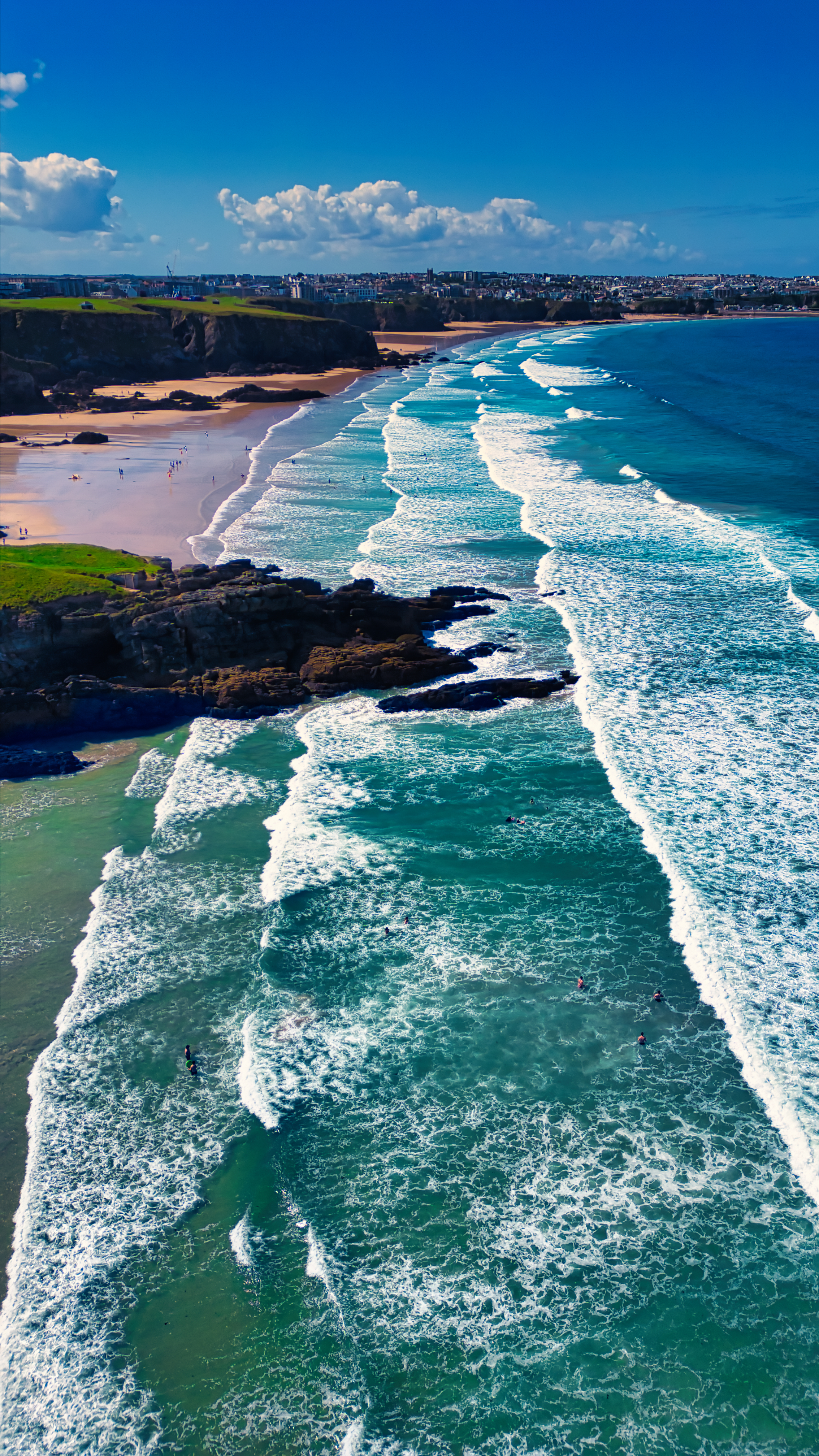 Aerial view of a beautiful coastline with waves crashing onto the shore. The beach is sandy with some rocky formations, and there are a few surfers in the water. The sky is bright blue with fluffy white clouds, creating a picturesque scene.