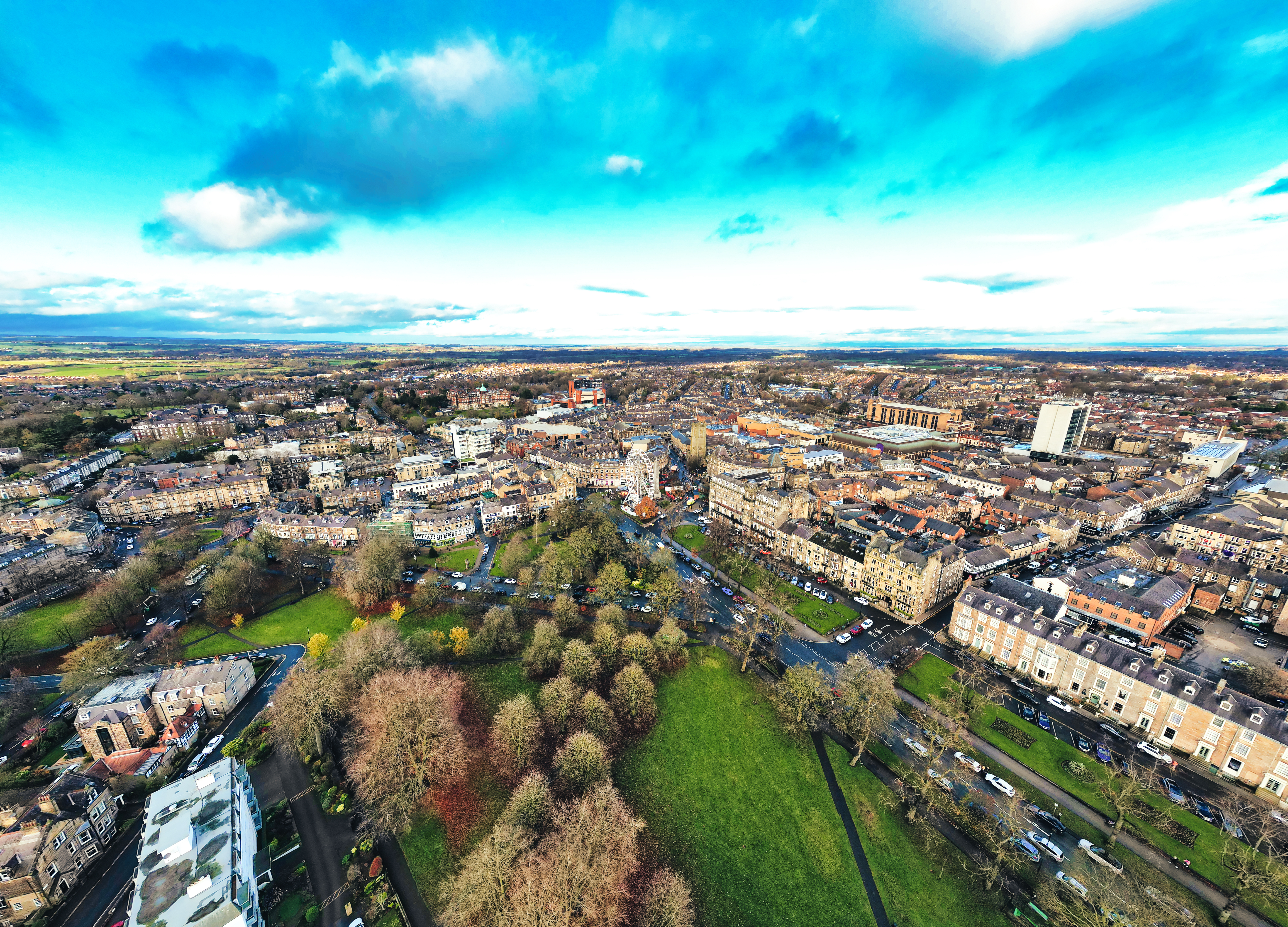 Aerial view of a town, showcasing a blend of residential and commercial buildings, roads, parks, and a vibrant cityscape under a partly cloudy sky. The image features a prominent green park space adjacent to dense urban development.