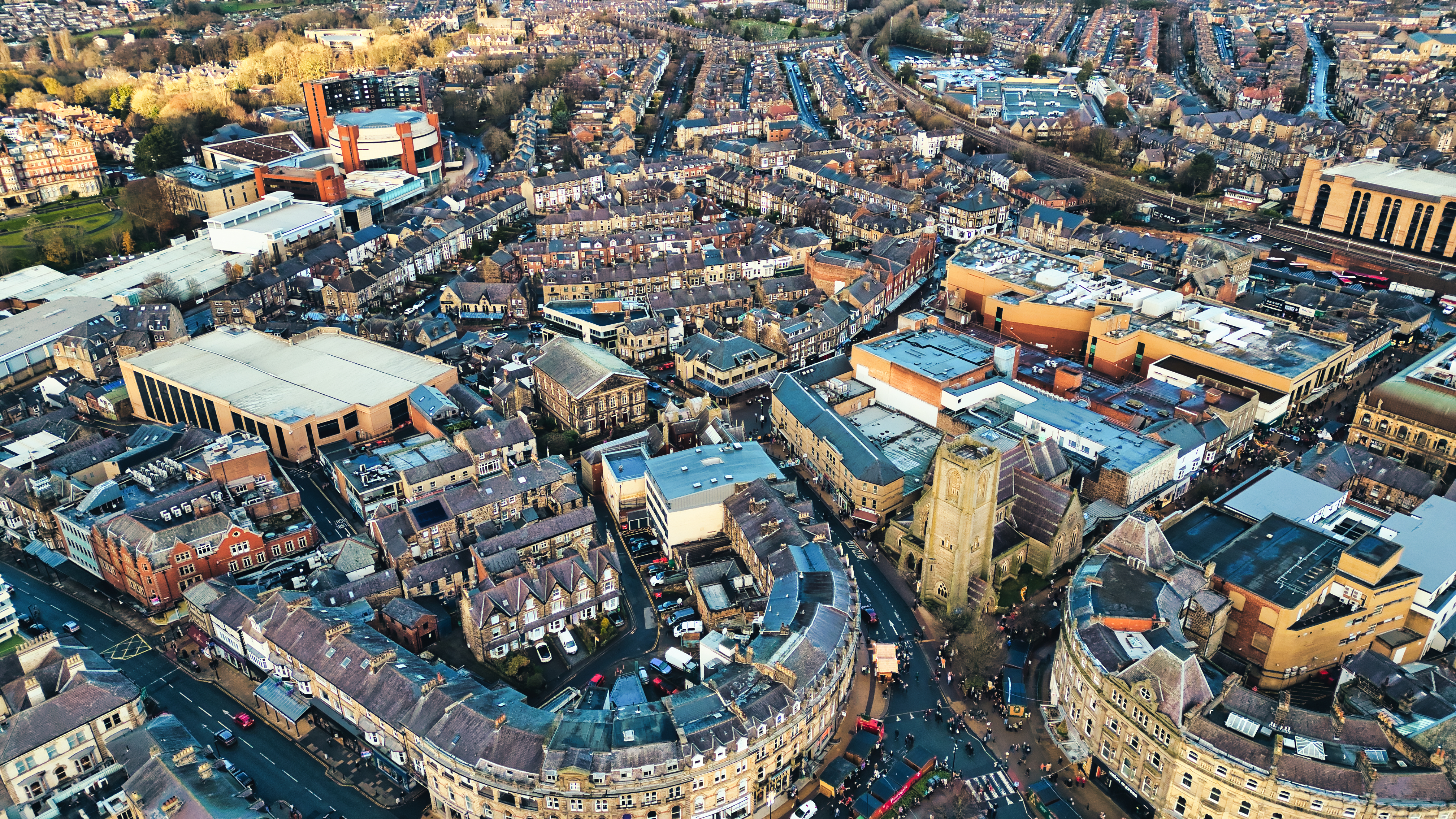 Aerial view of a town center, showcasing a mix of residential and commercial buildings, including a curved street lined with buildings, a large shopping center, and a church tower. The image features a variety of roof styles and building heights.