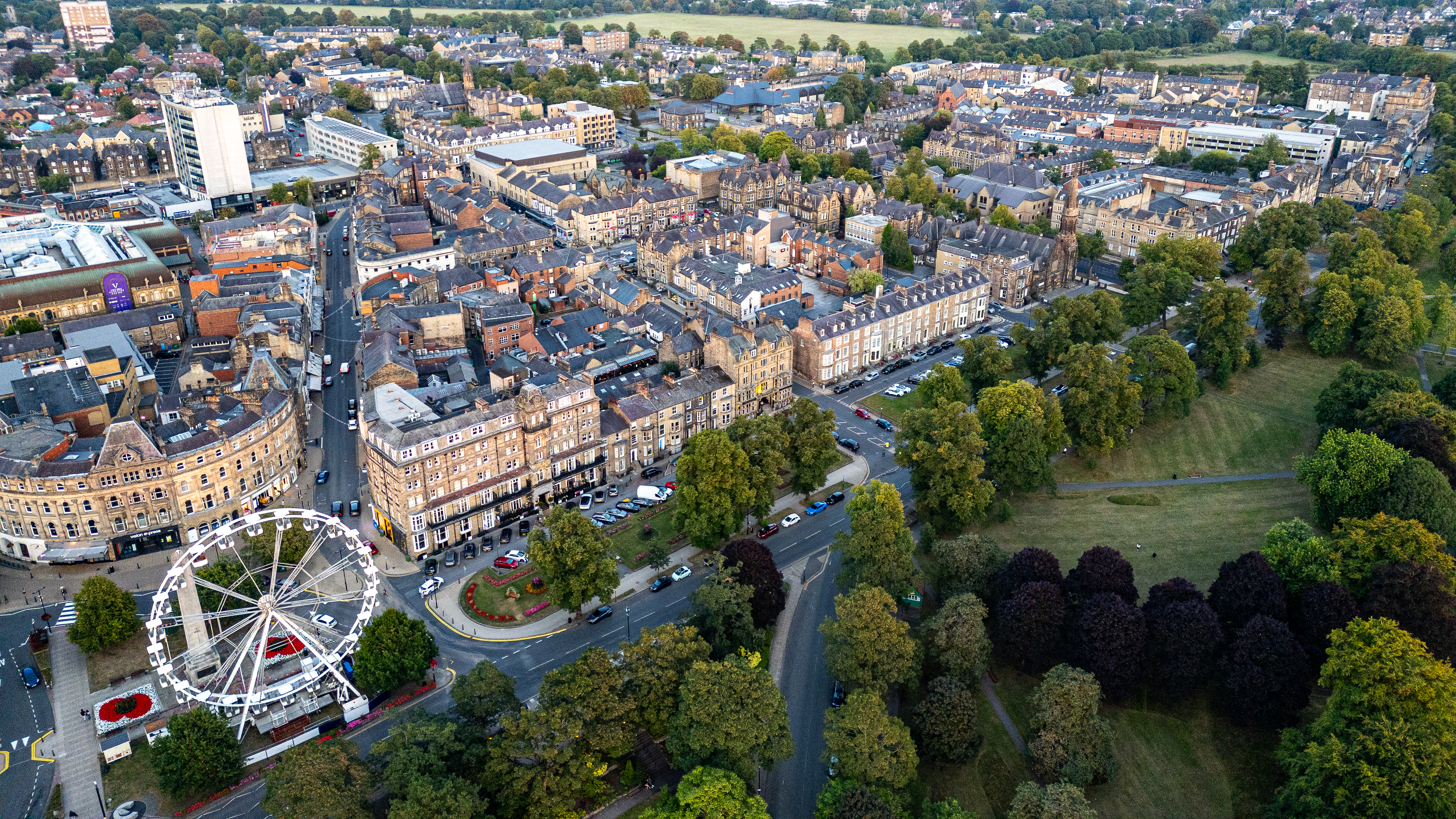 Aerial view of a European town with historic buildings, a Ferris wheel, a park, and trees under a cloudy sky in Harrogate, UK.