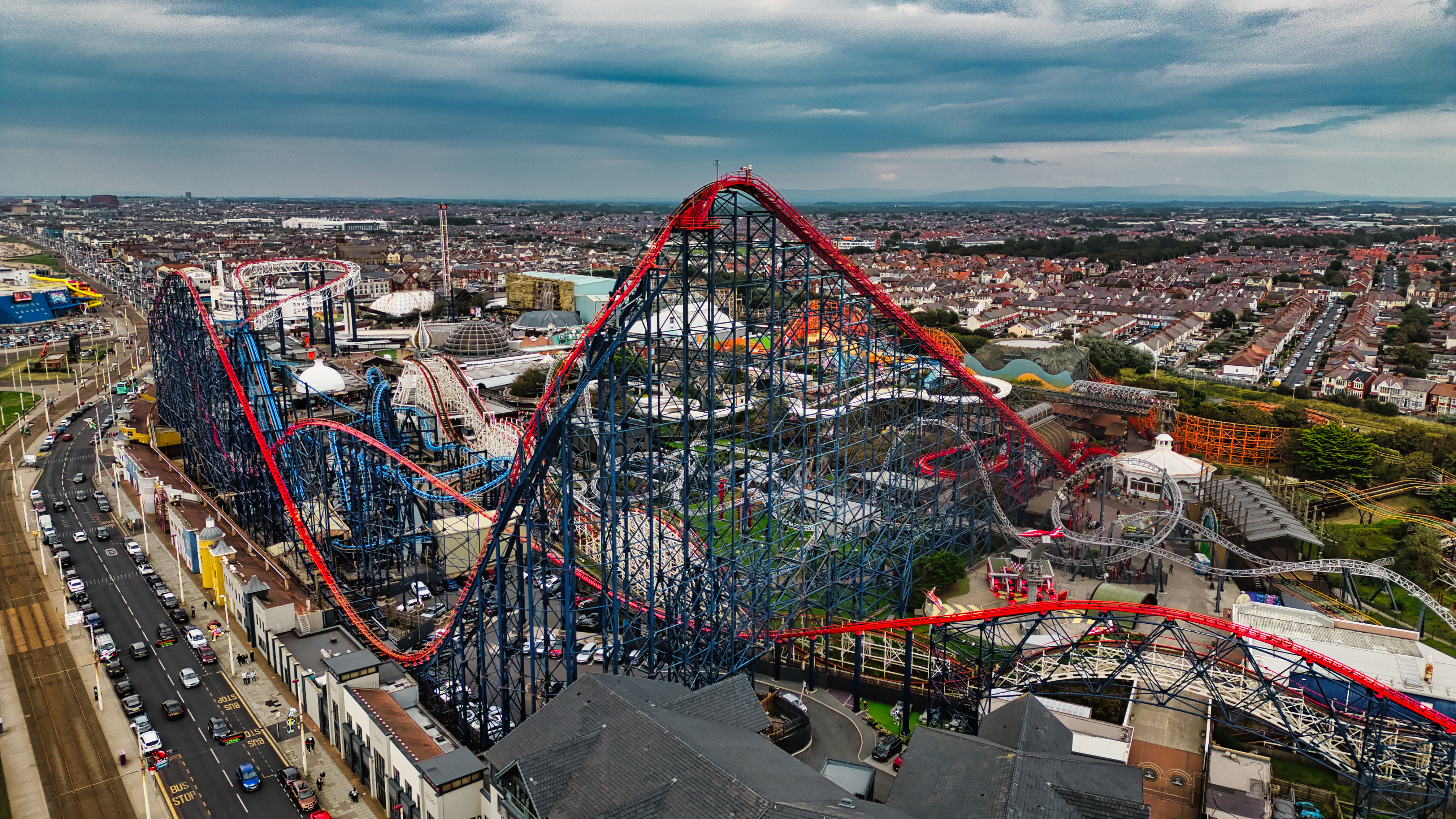 Aerial view of a vibrant amusement park featuring a large roller coaster with red and blue tracks. The park is bustling with rides and attractions, set against a backdrop of a cityscape under a cloudy sky.
