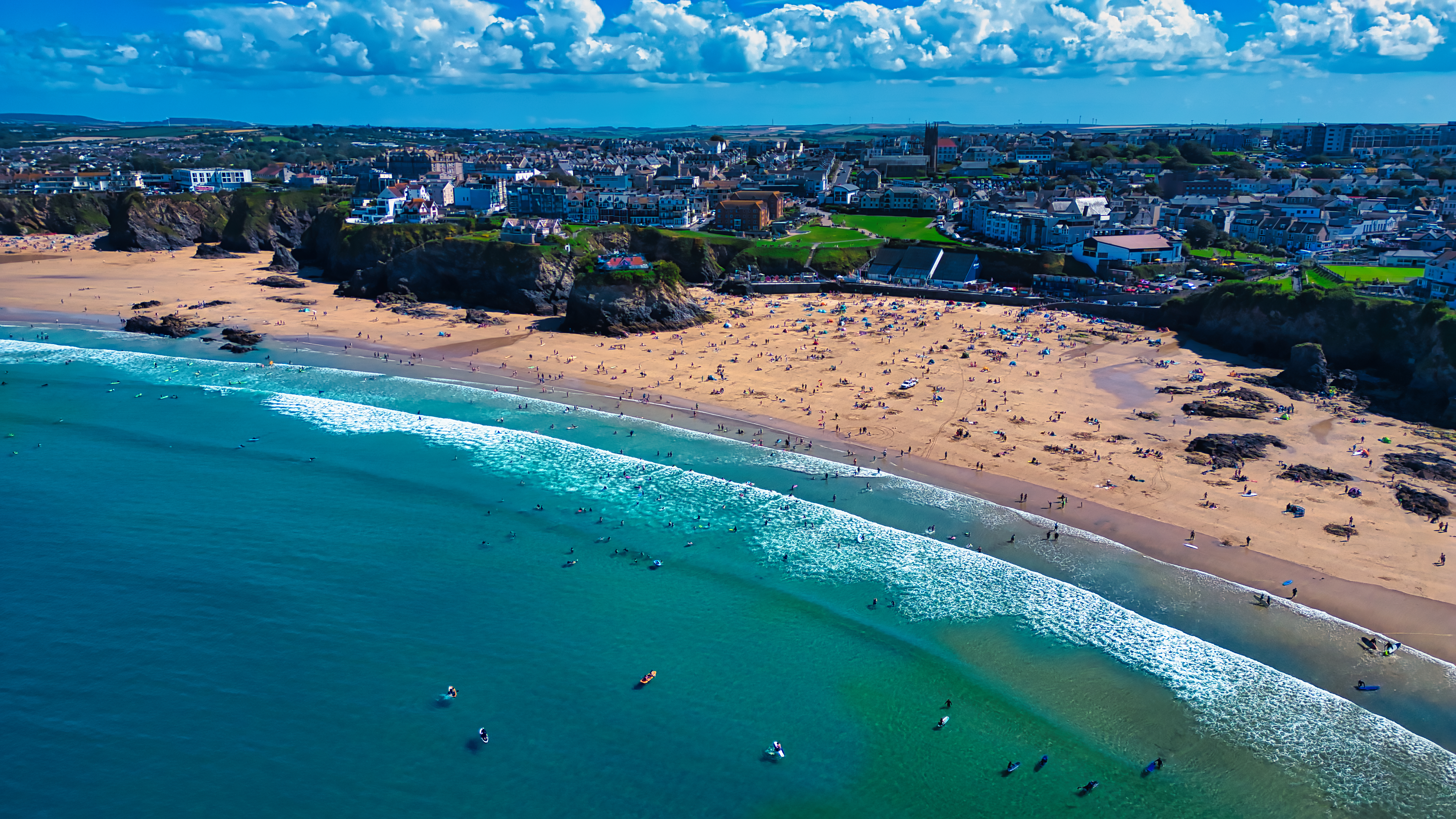 Aerial view of a beautiful beach with golden sand and turquoise waters, dotted with surfers and small boats. The coastline features cliffs and a vibrant town in the background under a bright blue sky with fluffy clouds.