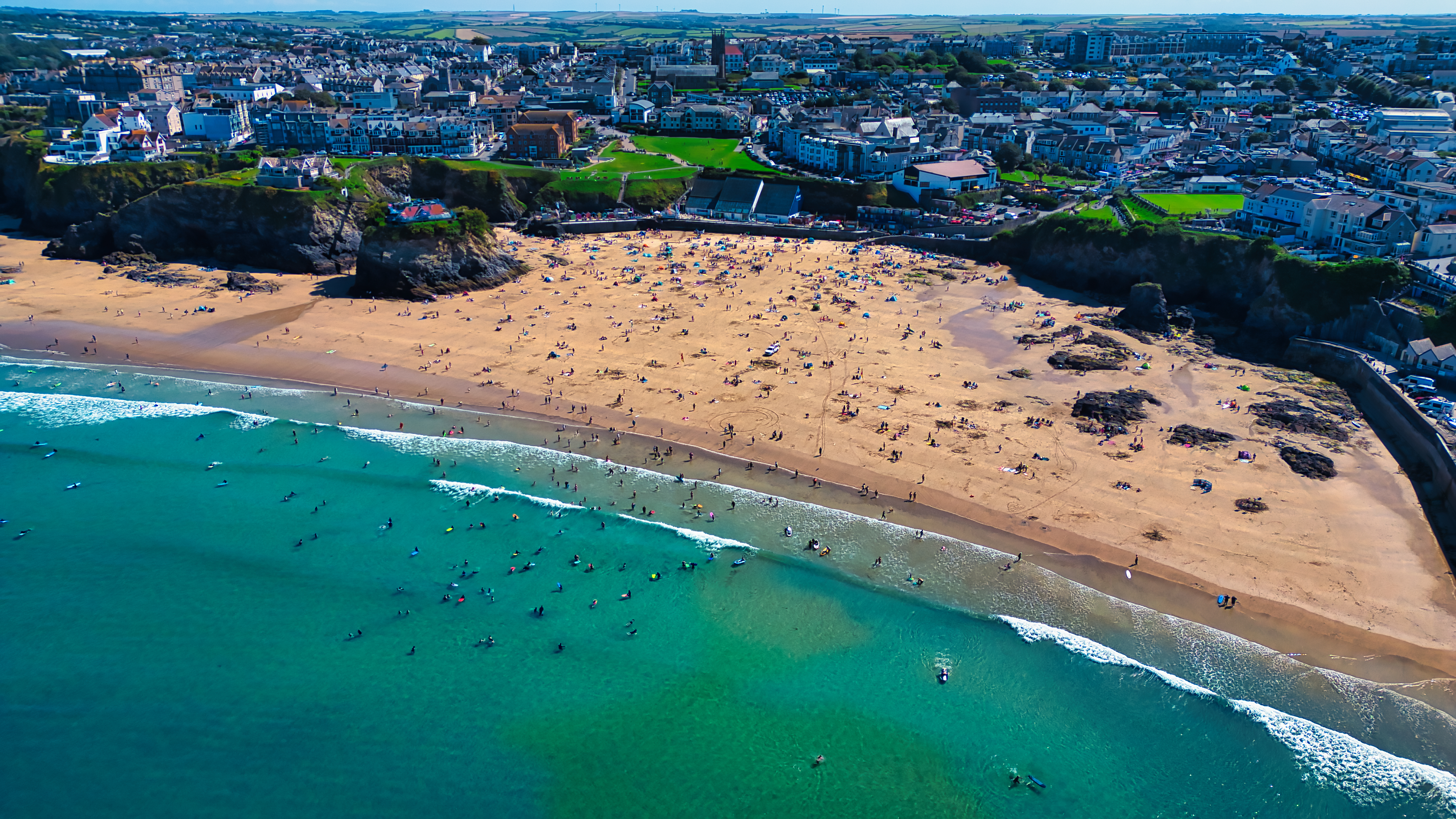 Aerial view of a sandy beach with numerous people sunbathing and swimming. The coastline features clear turquoise waters and gentle waves, while the background shows a vibrant town with buildings and greenery. The scene captures a lively summer day at the beach.