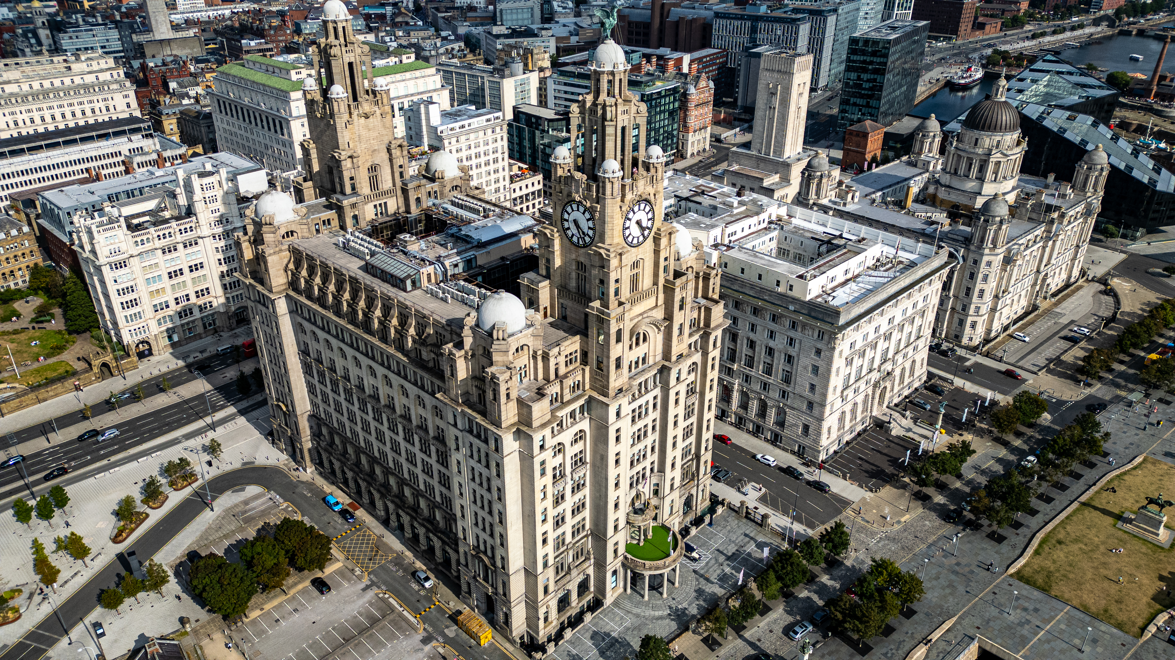 Aerial view of the Royal Liver Building with its iconic clocks, surrounded by other historical and modern buildings and a waterfront.