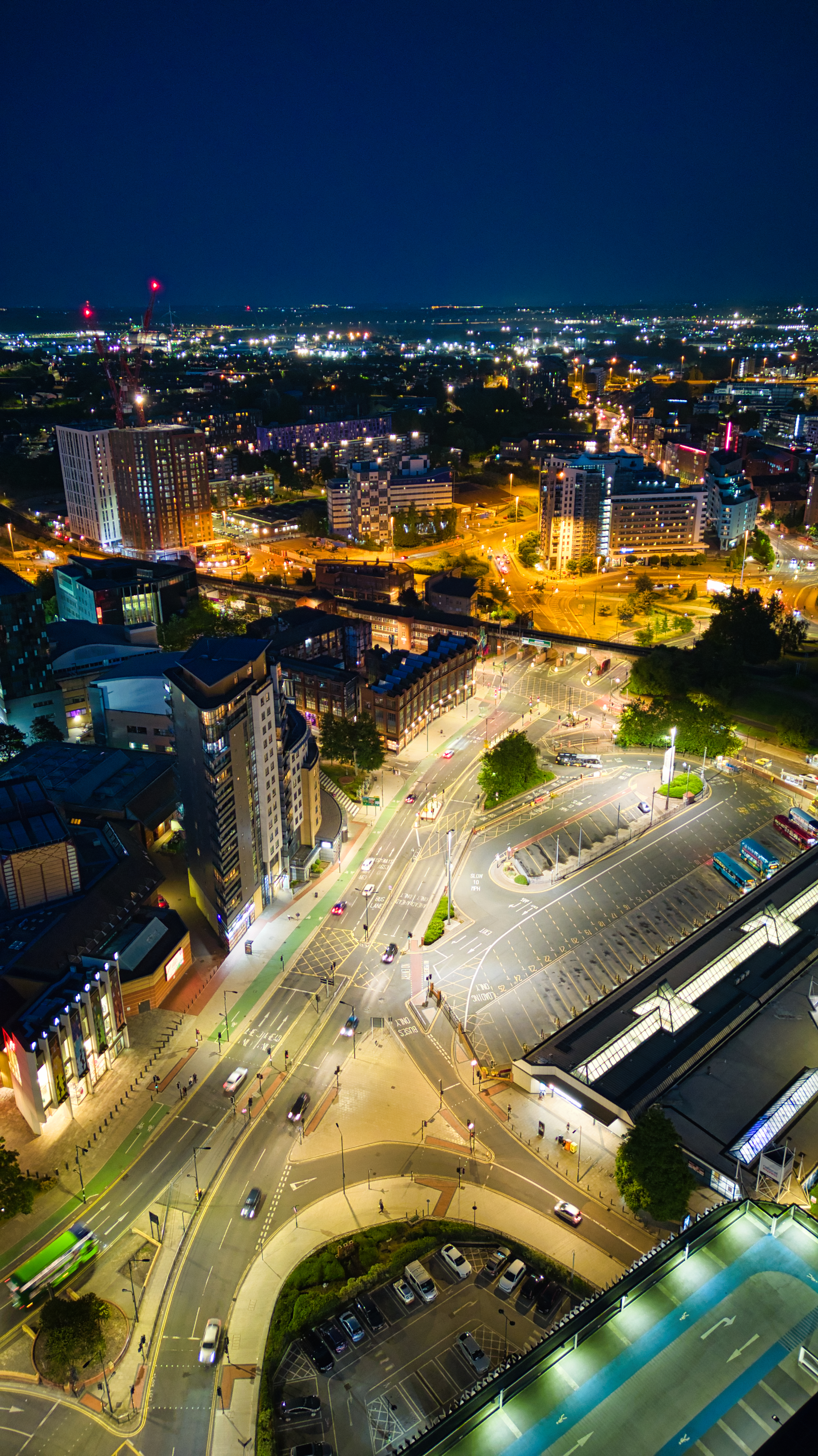 Aerial night view of a bustling city intersection with illuminated streets and buildings in Leeds.