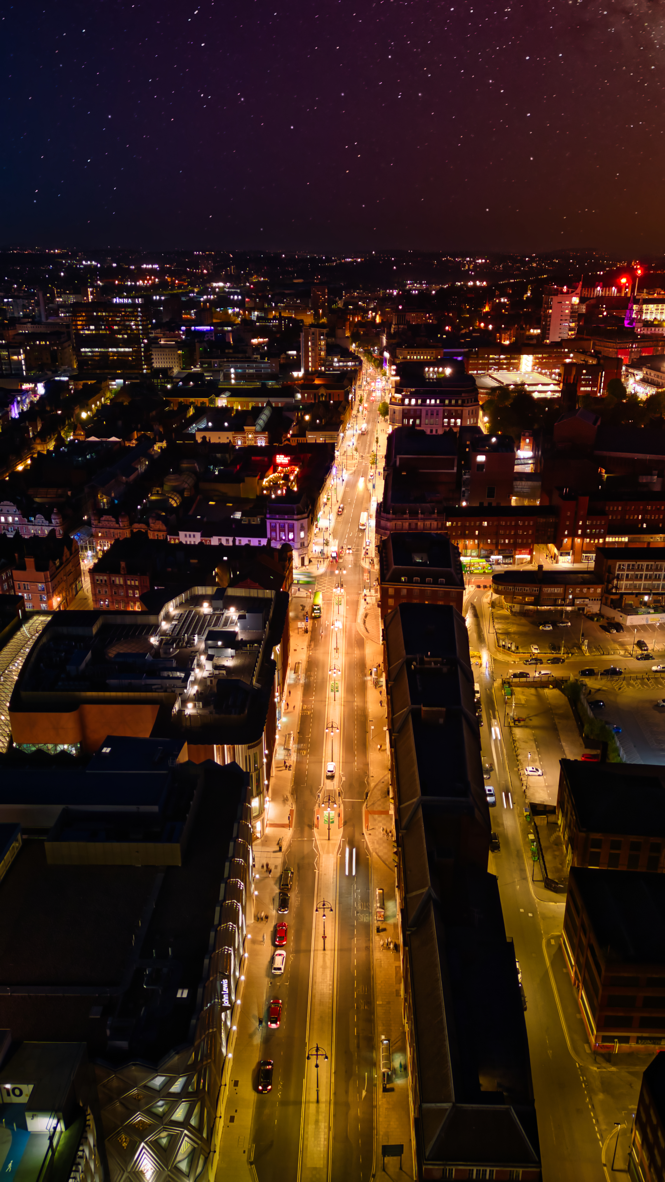 Aerial night view of a bustling city street with glowing lights from vehicles and buildings in Leeds.
