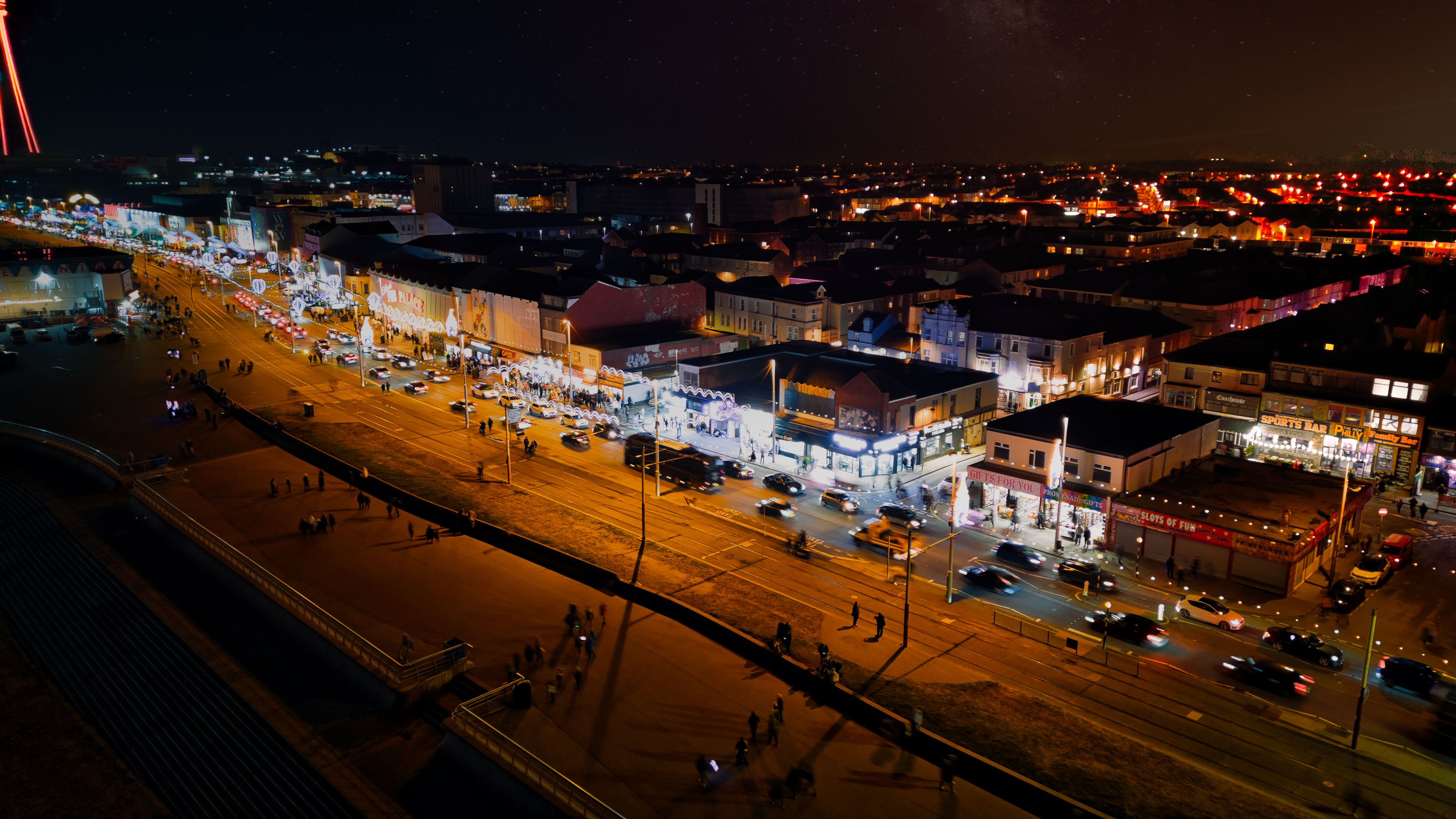 Aerial night view of a bustling city street with illuminated buildings and traffic in Backpool, England.