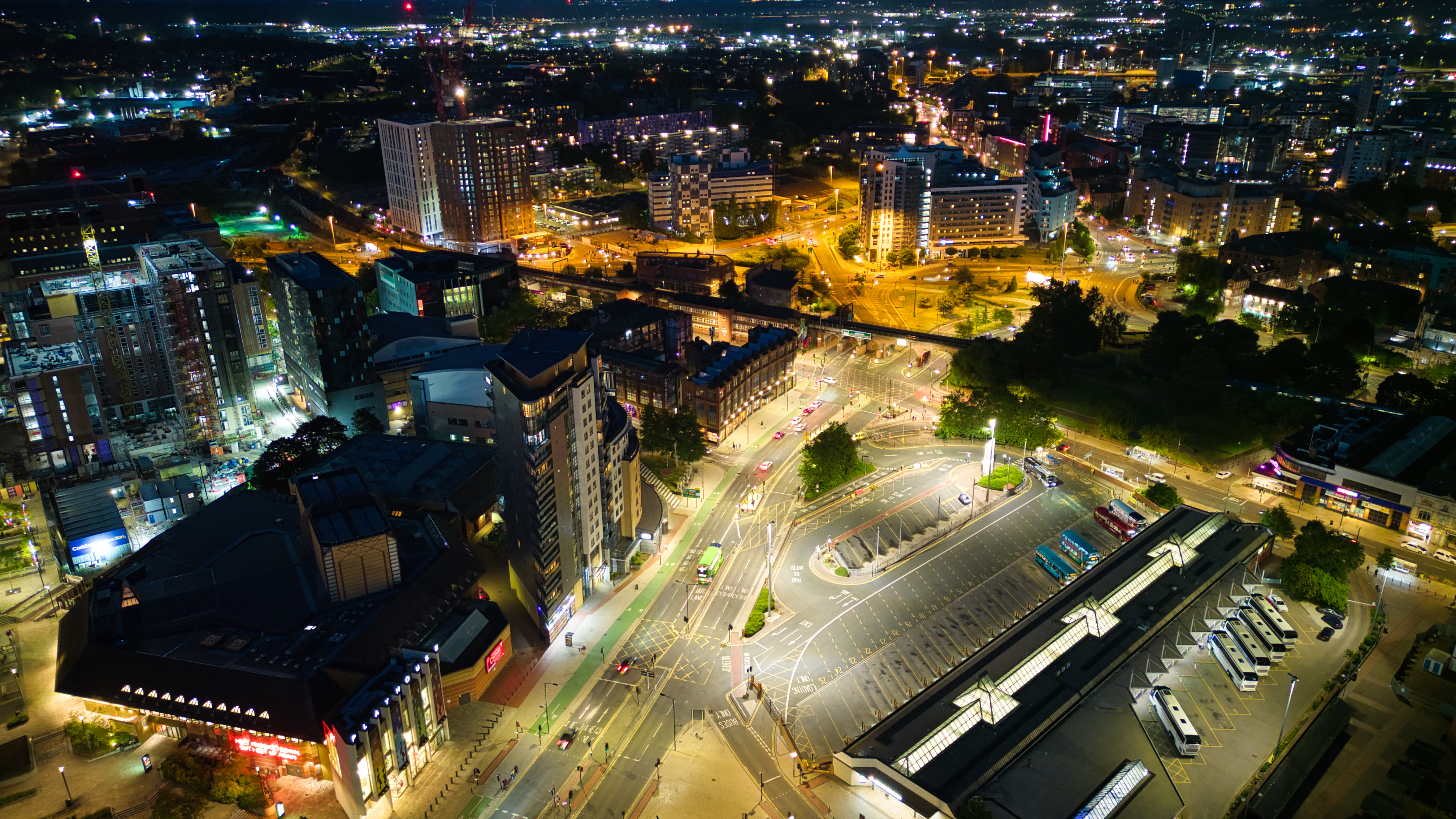 Aerial night view of a bustling cityscape with illuminated streets and urban architecture in Leeds.