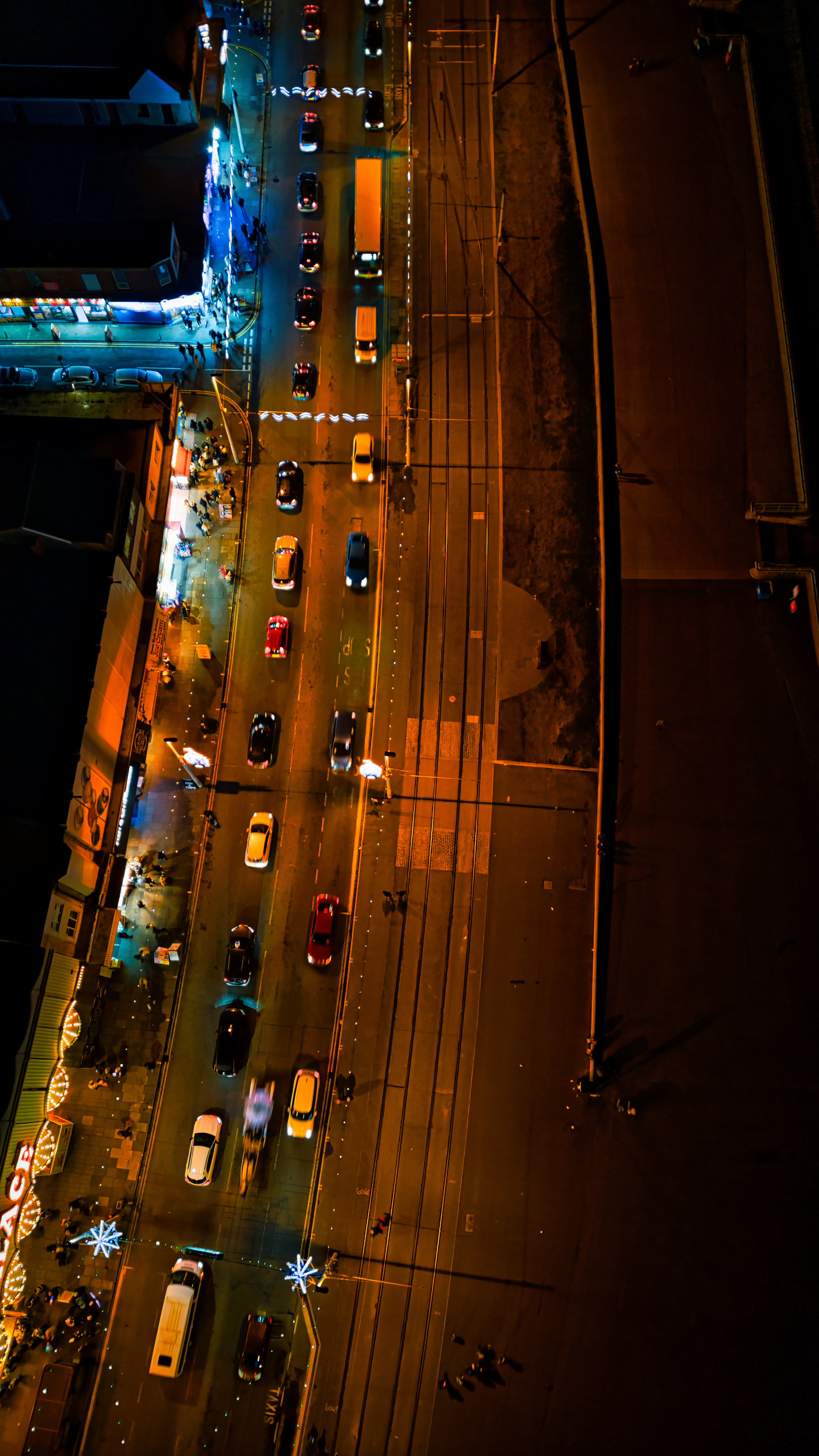 Aerial night view of a busy street with car lights and urban lighting, creating a vibrant cityscape in Backpool, England.