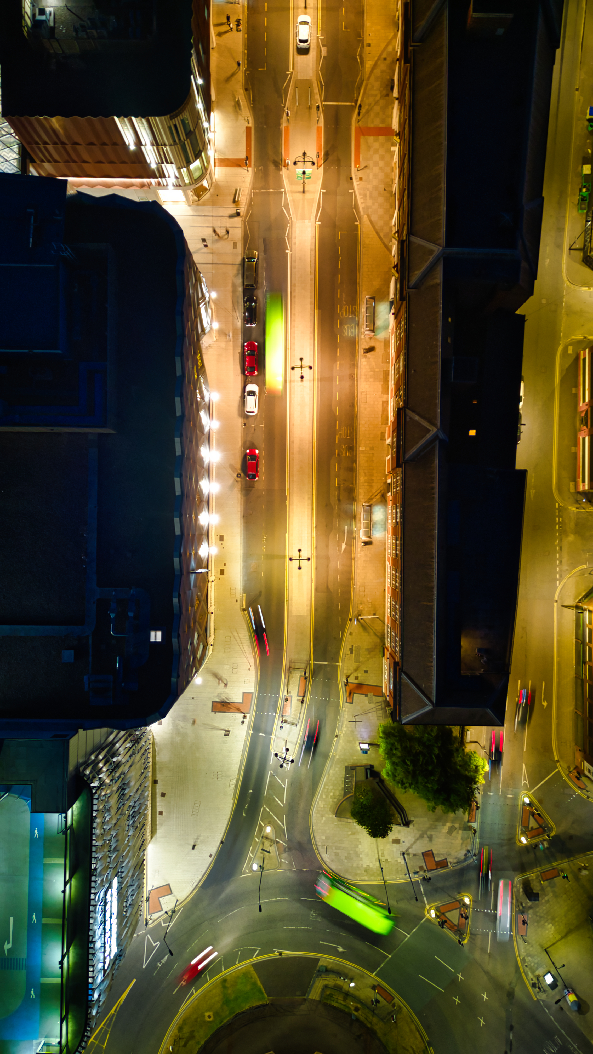 Aerial night view of a city street with traffic, illuminated buildings, and a curved road in Leeds.