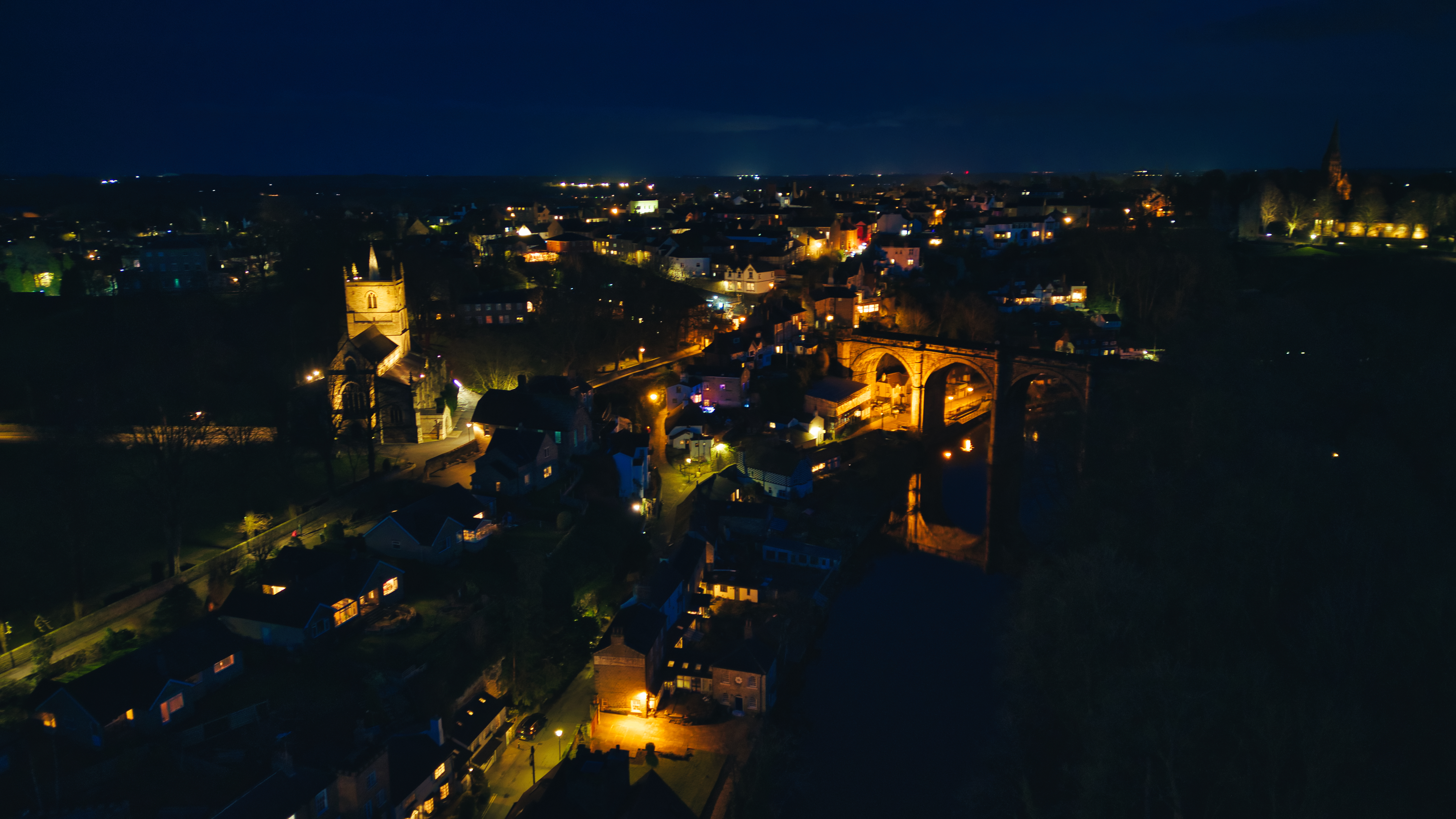 Aerial night view of a cityscape with illuminated buildings and streets, showcasing urban architecture in Knaresborough, North Yorkshire