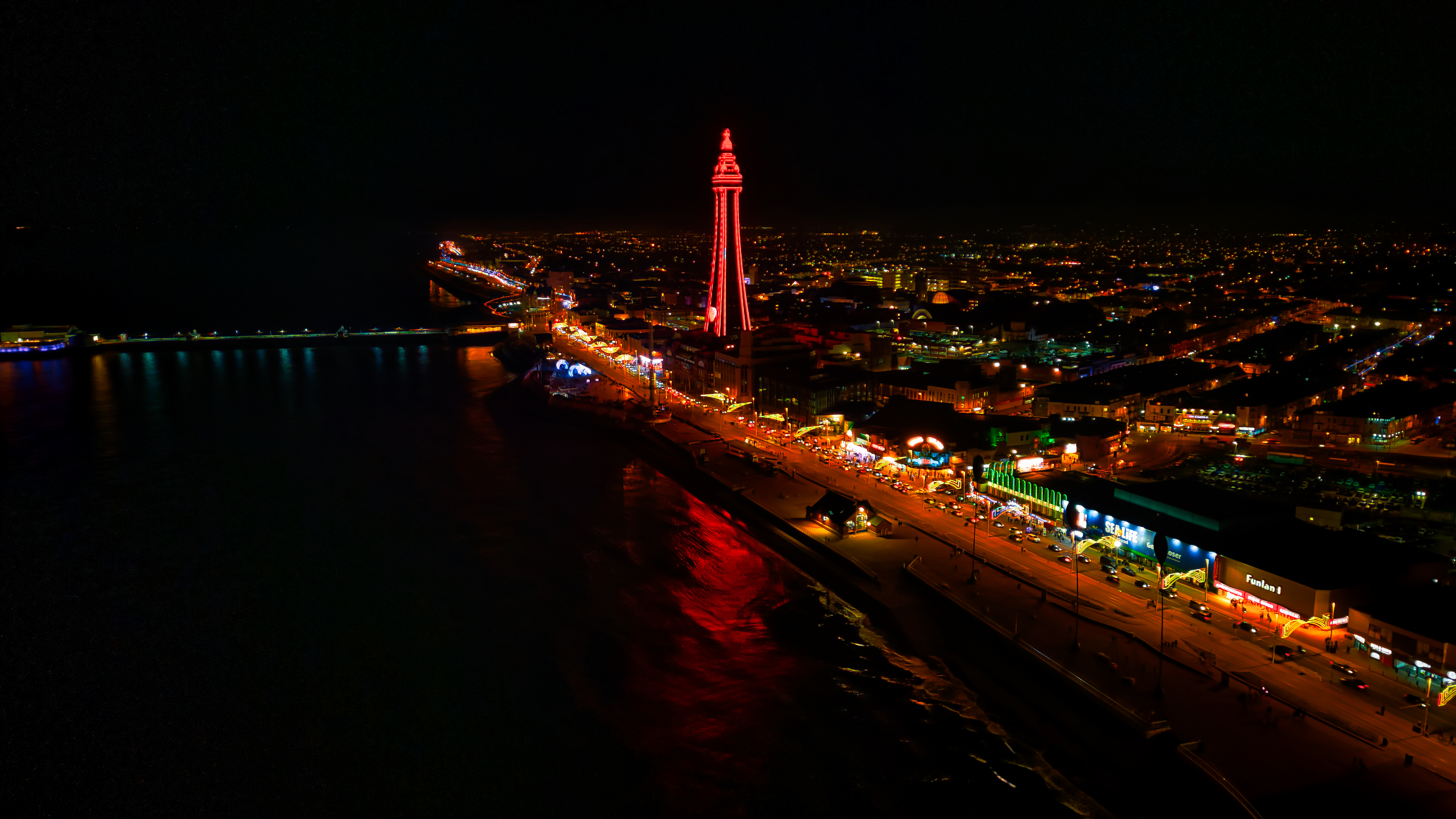 Aerial night view of a cityscape with illuminated streets and a prominent tower, next to a dark coastline in Backpool, England.
