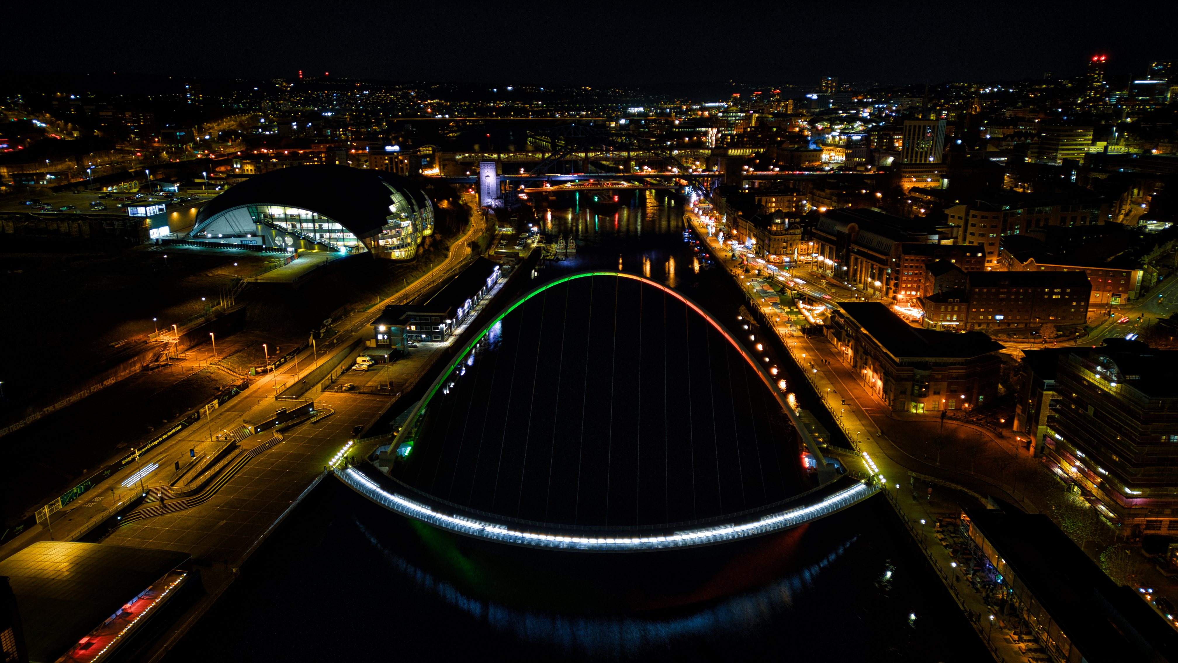 Aerial night view of a cityscape with illuminated streets and buildings, featuring a distinctive curved bridge over a river in Newcastle upon Tyne