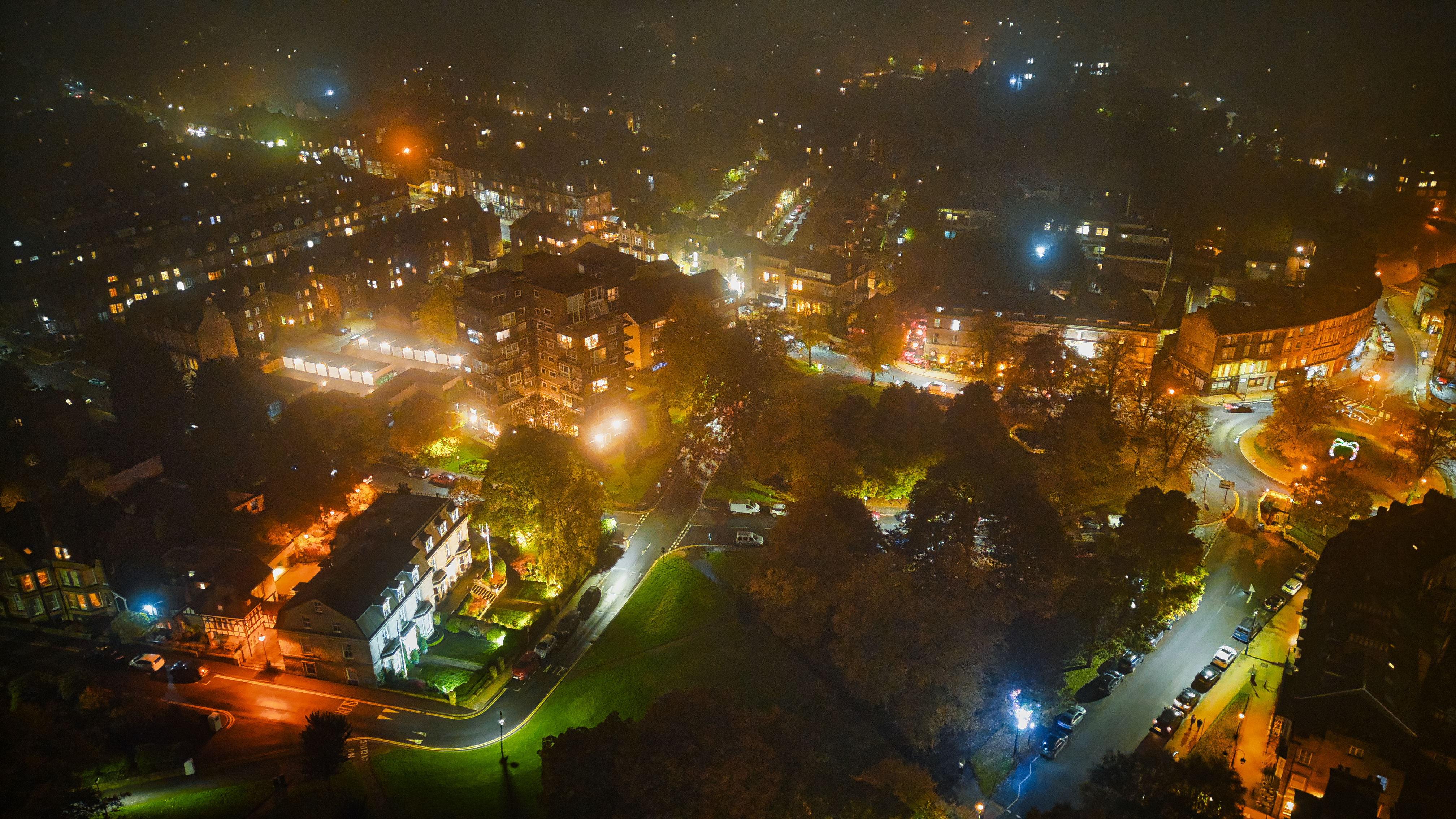 Aerial night view of a cityscape with illuminated streets and buildings, showcasing urban life and infrastructure in Harrogate, North Yorkshire.